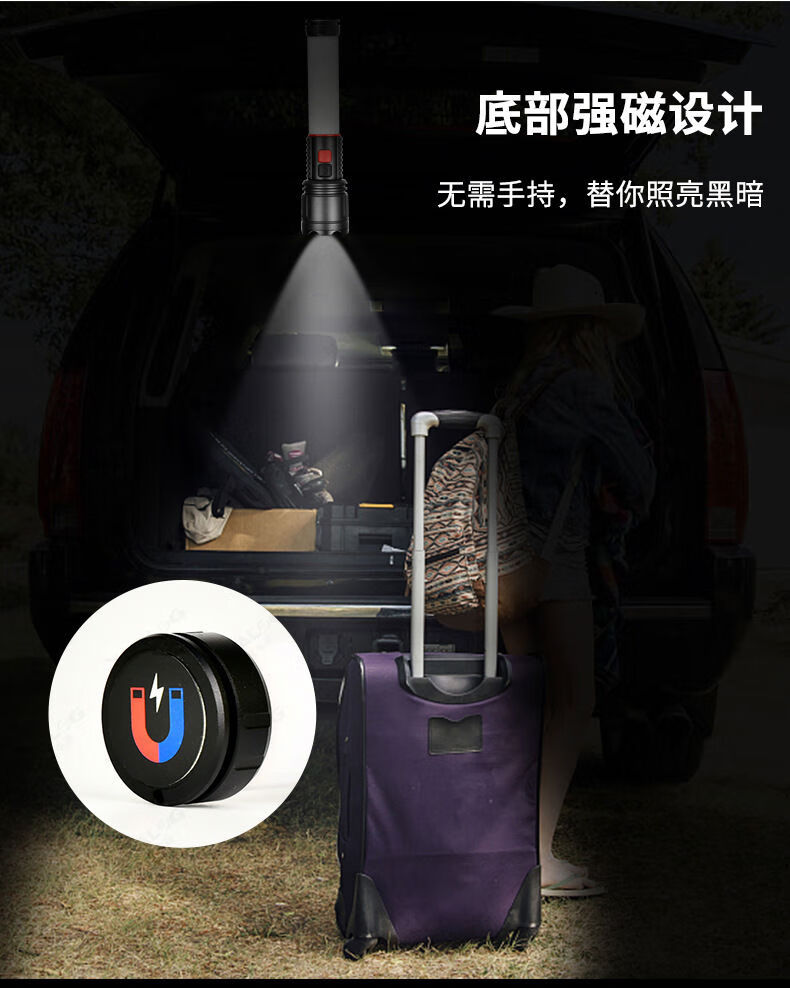 手电筒三眼灯爆亮手电筒便携强光手电筒多功能带磁铁充电照明装备 电镀黑带磁铁