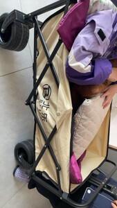 推车满大的,够装,平时快递和小朋友坐在上面都没问题,拉起来蛮顺滑的,轮子不是很大的,还没到很远的地方使用,目前就去拿快递的距离来说是ok的,就是手拉那里的长度感觉厂家还可以设计长一点,使用起来感觉差那么一点没法直接站直,需要稍微往后靠一些,大高个的话可能更明显