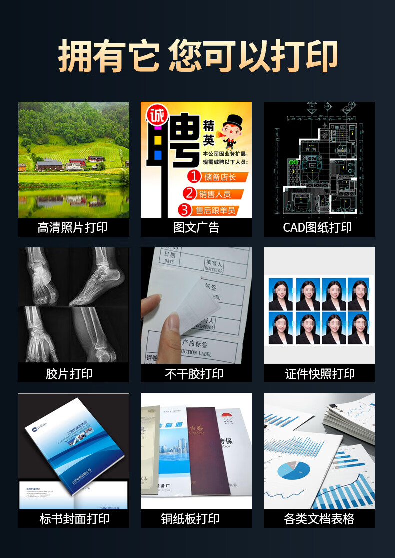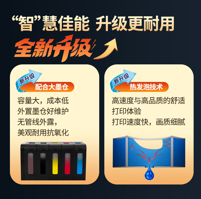 打印的照片清晰,文字打印更迅捷,外置升级墨水仓,墨水量大,价格更便宜更耐用。
