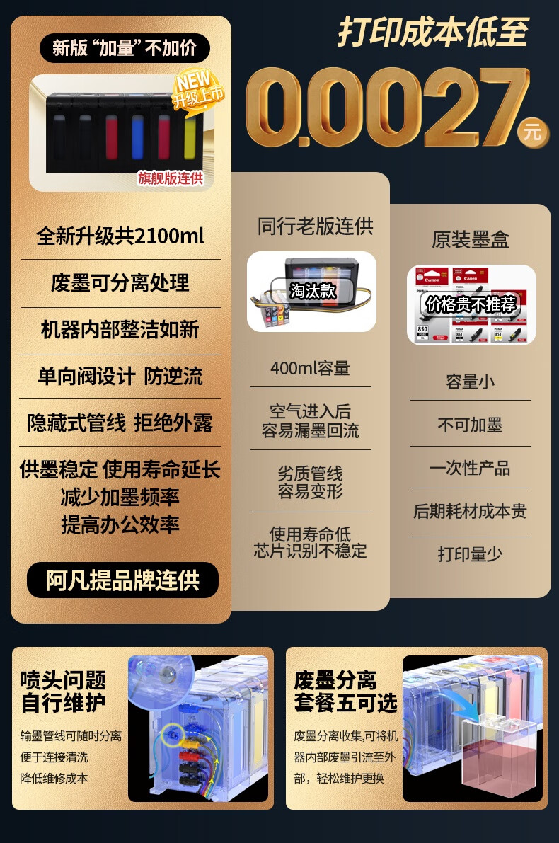 这个打印机非常的好用,性价比很高,打出来颜色还原度高,升级了大墨仓和外置废墨仓,再也不会漏墨了,打印机还能保持干净,墨水量也很大,可以用很久都不用去管。