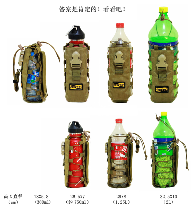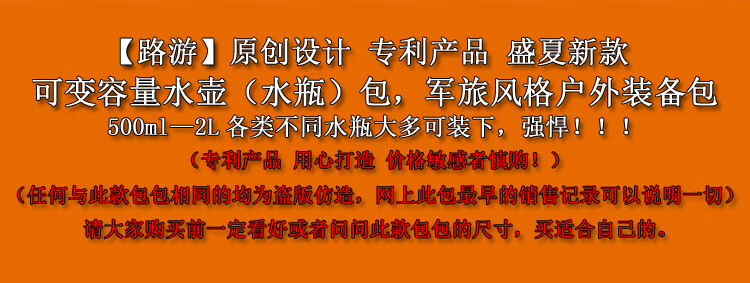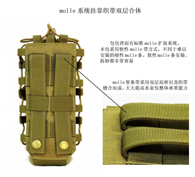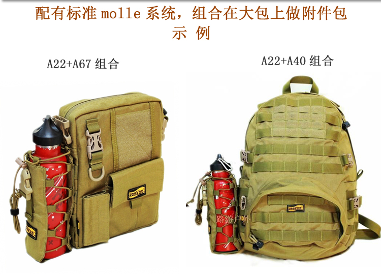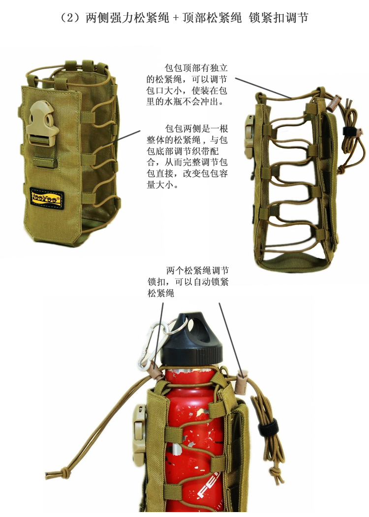 水瓶附件包,东西不错,用料扎实,比较能装东西,不同大小与瓶形的水瓶水罐大多都放得下,很实用,茉莉系统也很标准,适用范围广,希望今后能出轻量版。