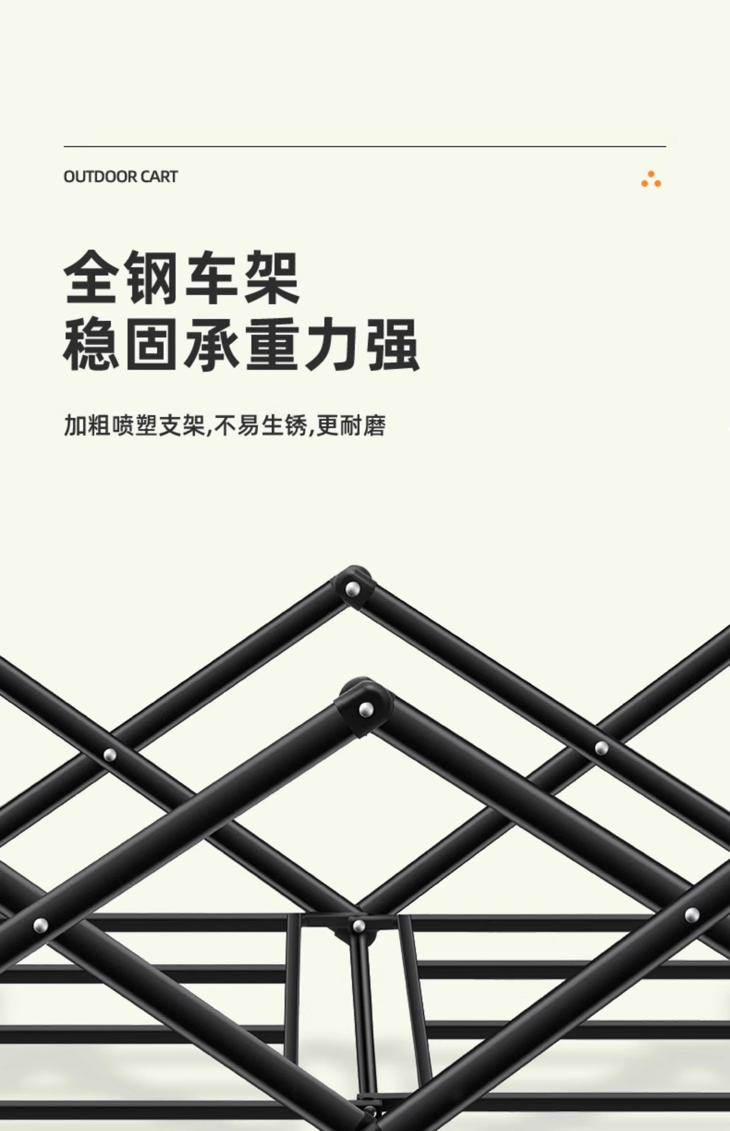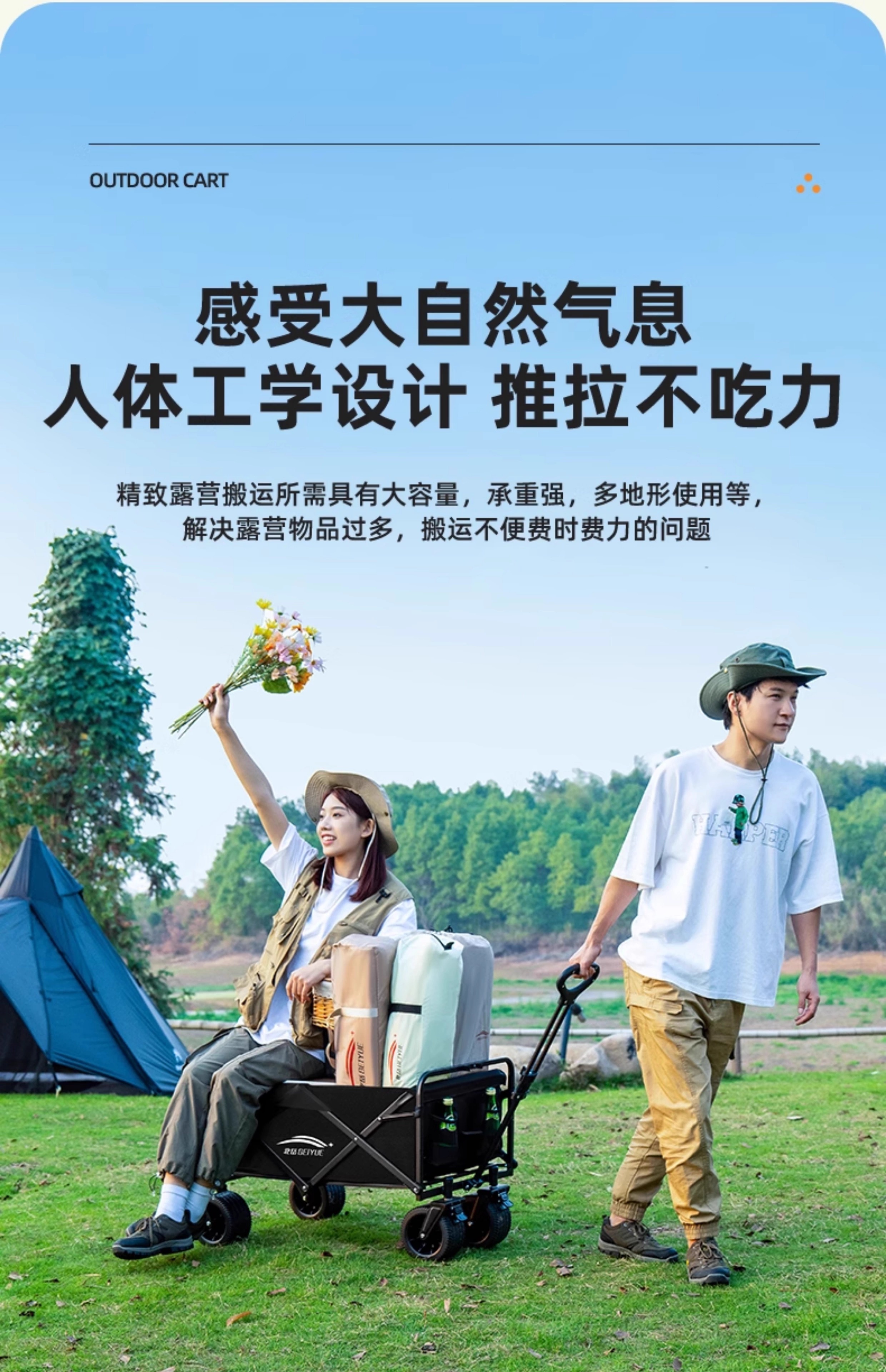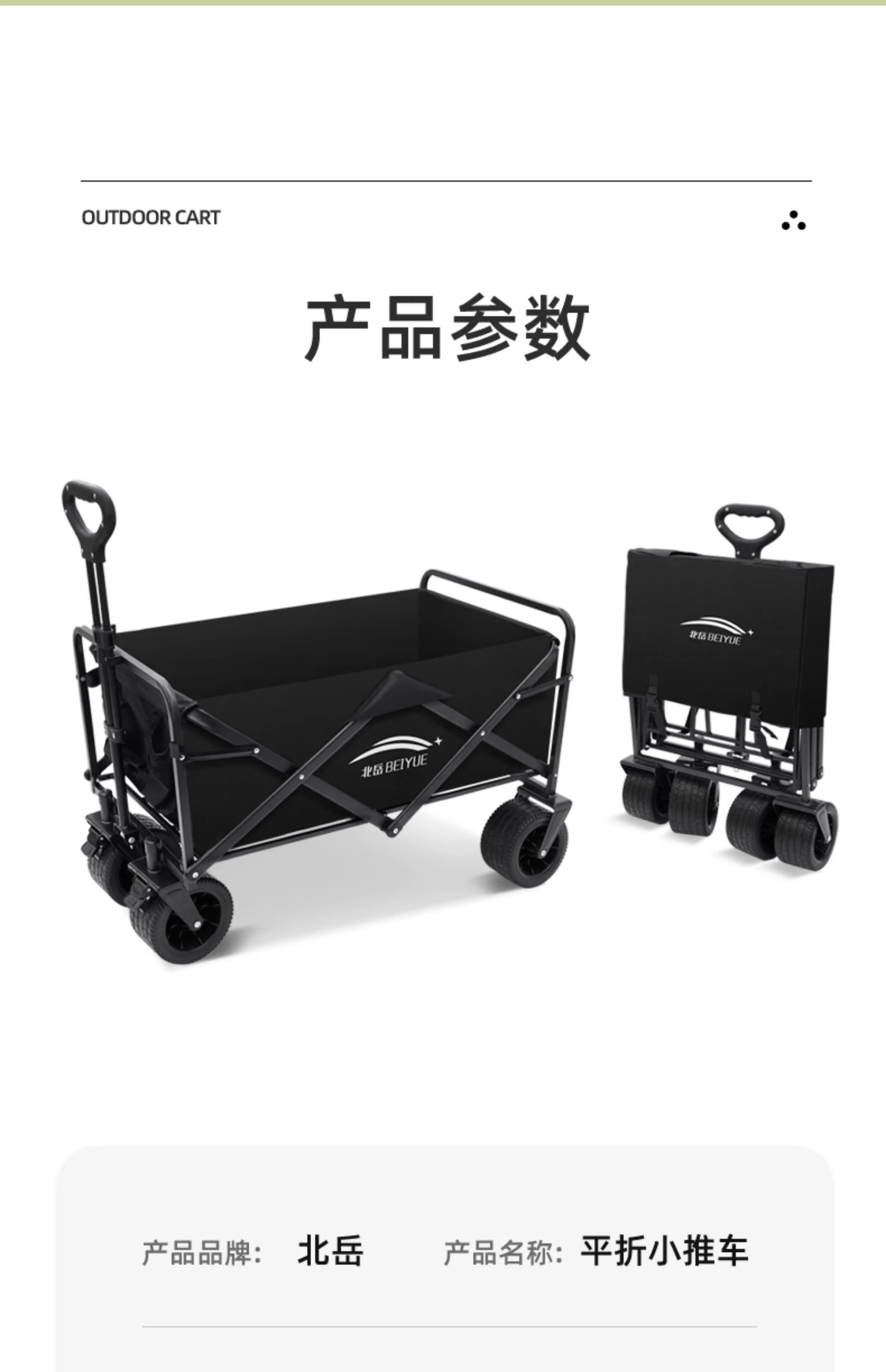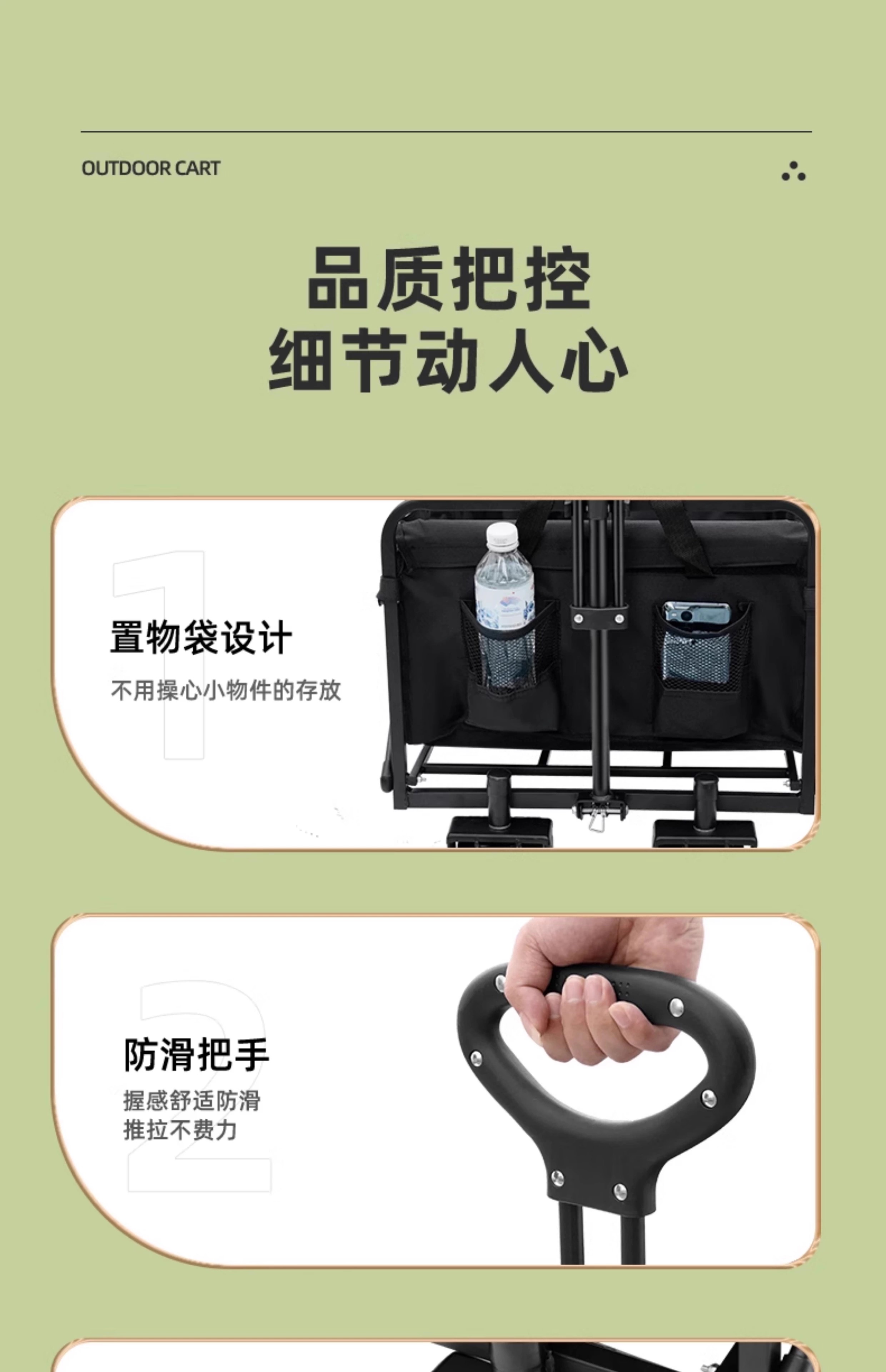 外观设计漂亮,尺寸大小合适,包装仔细完整,宝贝手感不错,感觉很好,发货速度快,服务态度一流,给力!5星好评!推车车轮很宽,质量很不错,转向也很灵活,质量很好,能放下我的帐篷还有折叠桌椅。非常适合户外活动时候装东西。