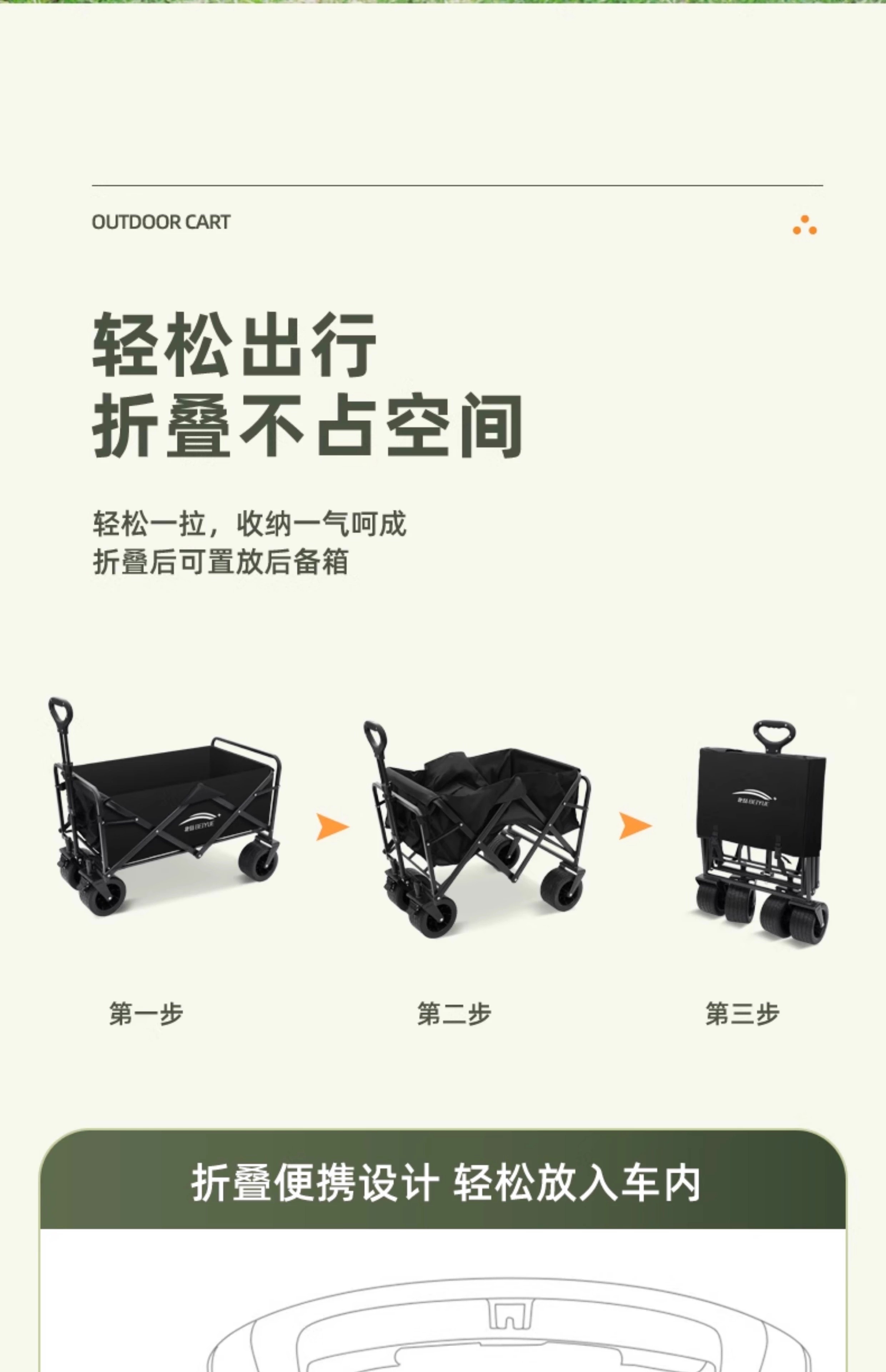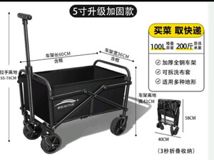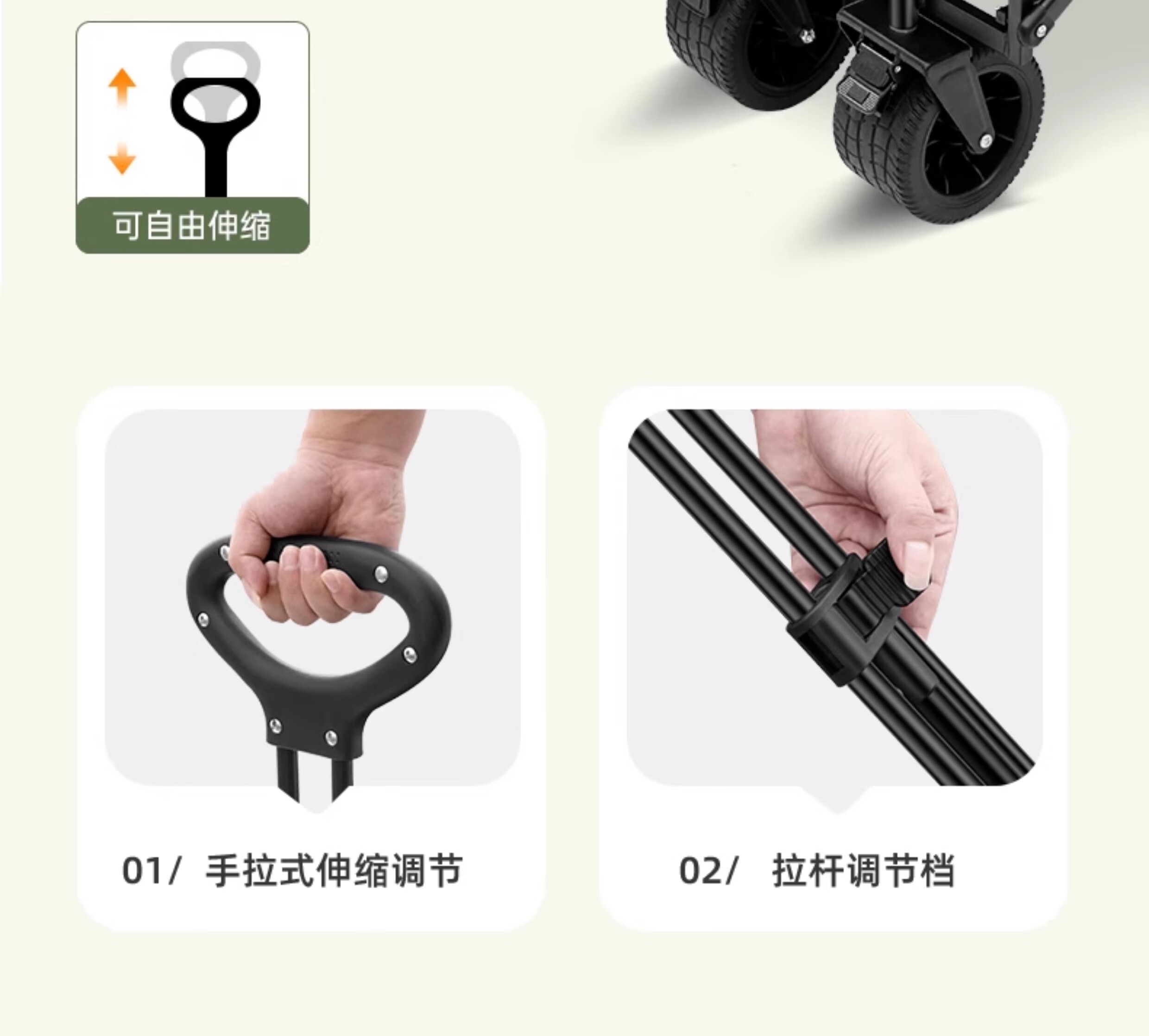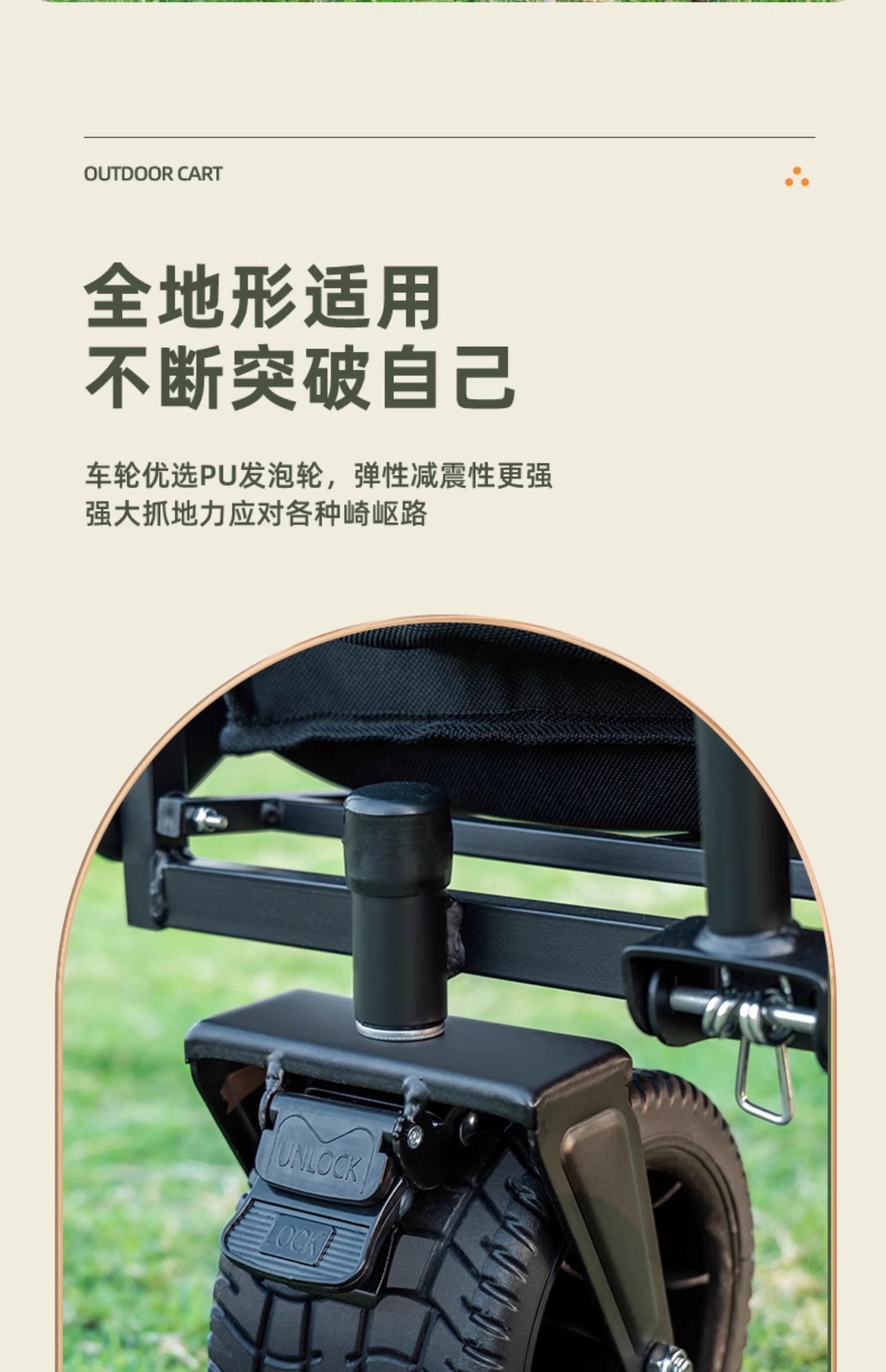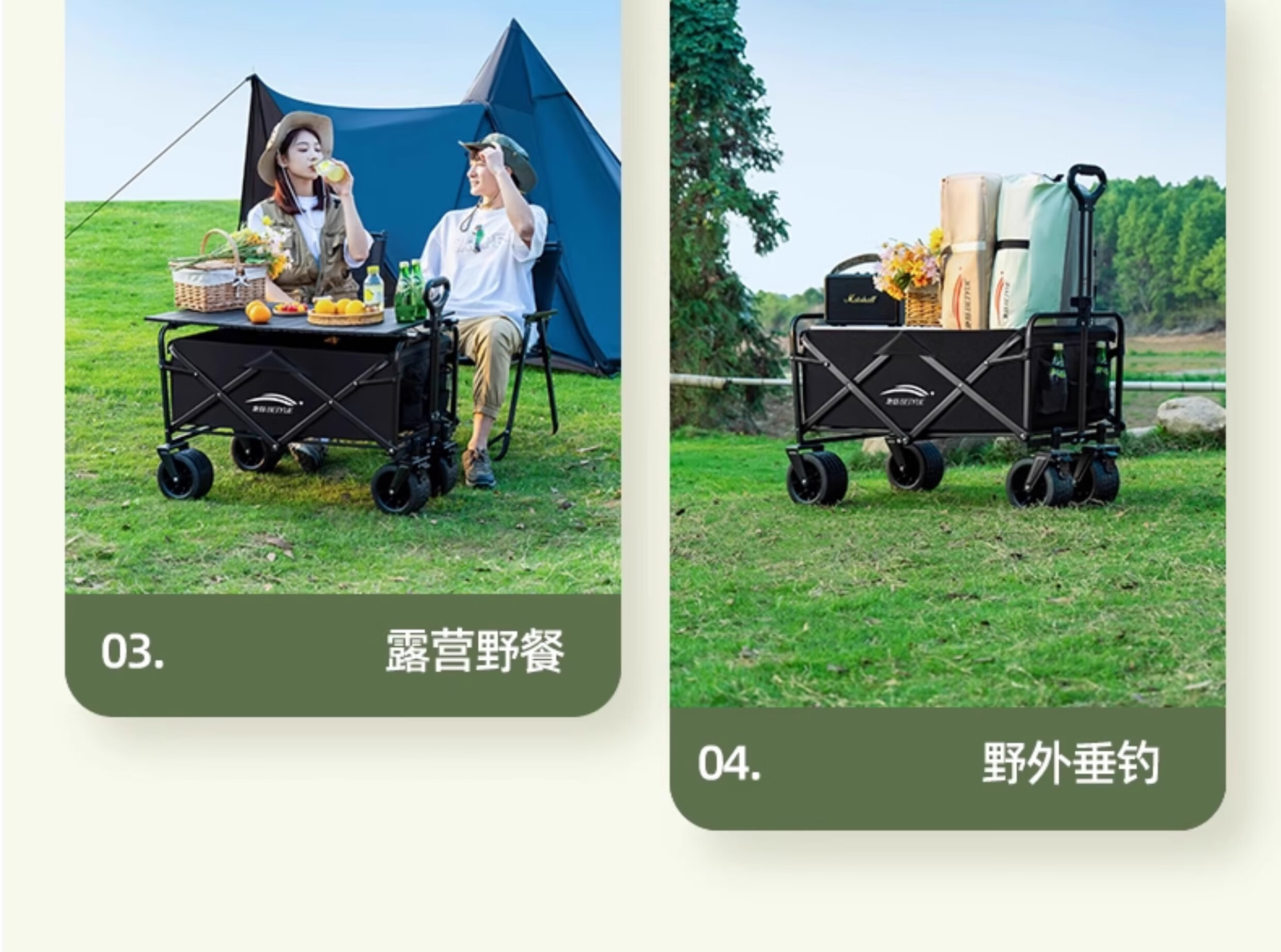 外观设计漂亮,尺寸大小合适,包装仔细完整,宝贝手感不错,感觉很好,发货速度快,服务态度一流,给力!5星好评!推车车轮很宽,质量很不错,转向也很灵活,质量很好,能放下我的帐篷还有折叠桌椅。非常适合户外活动时候装东西。