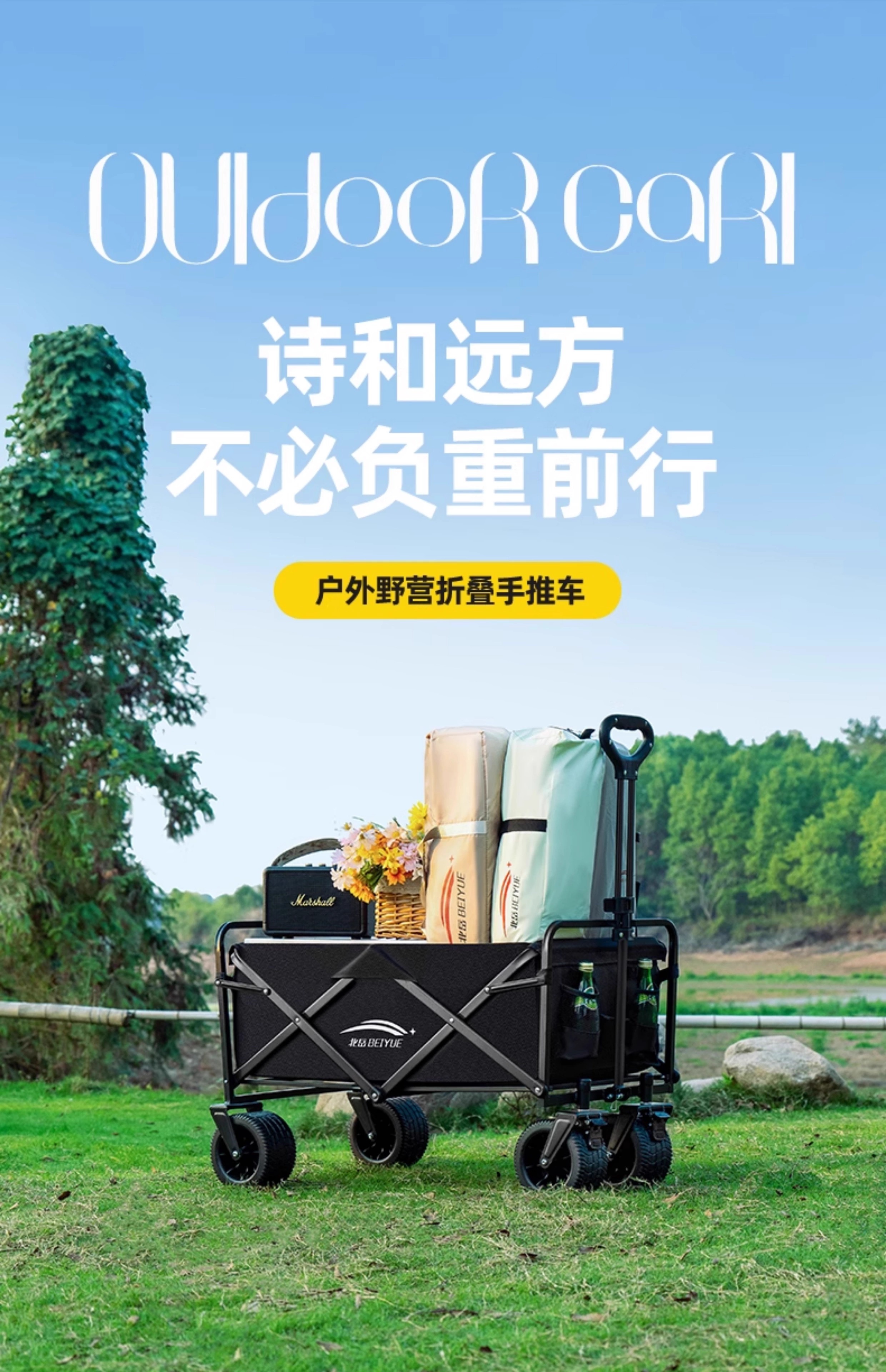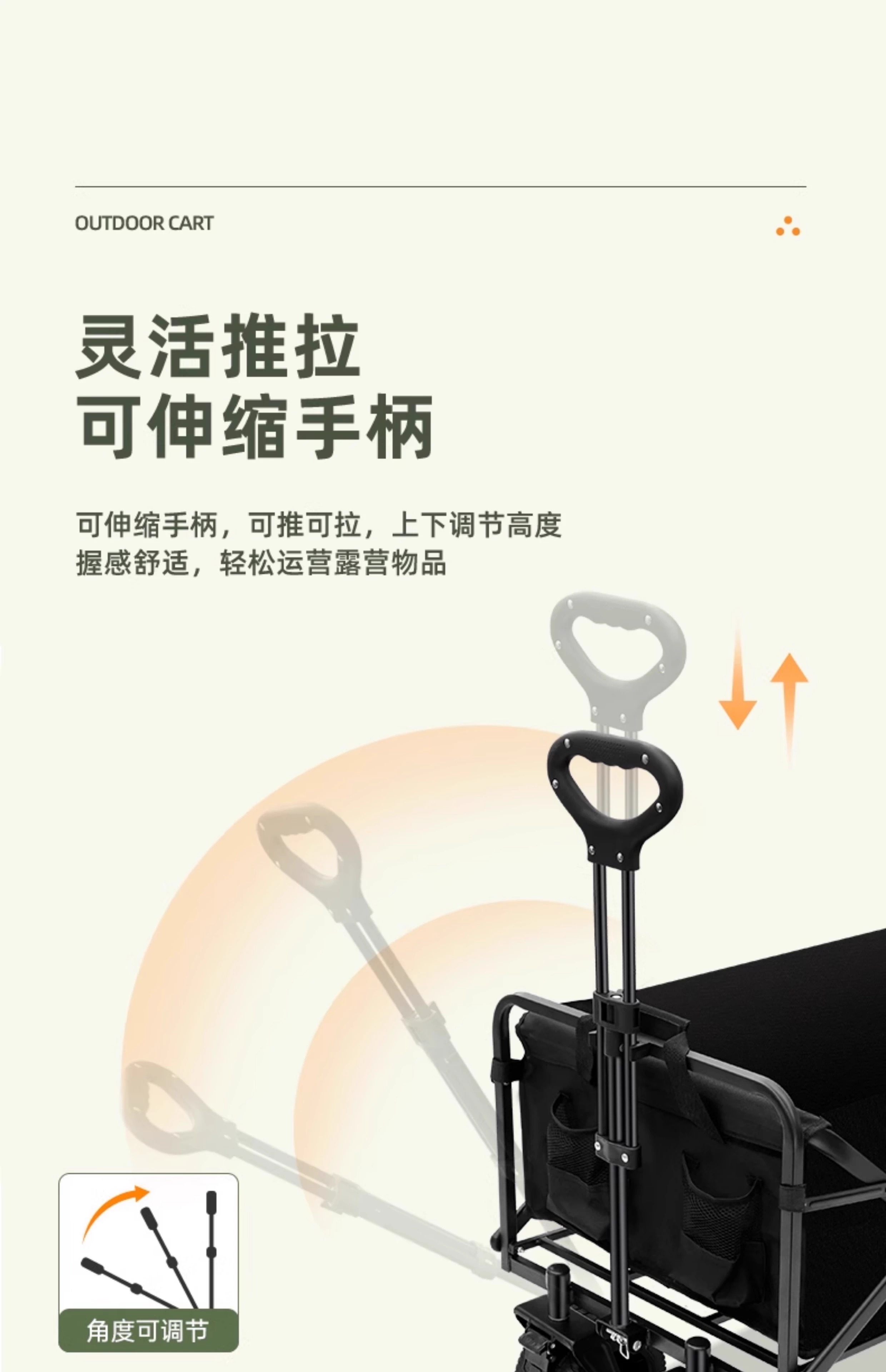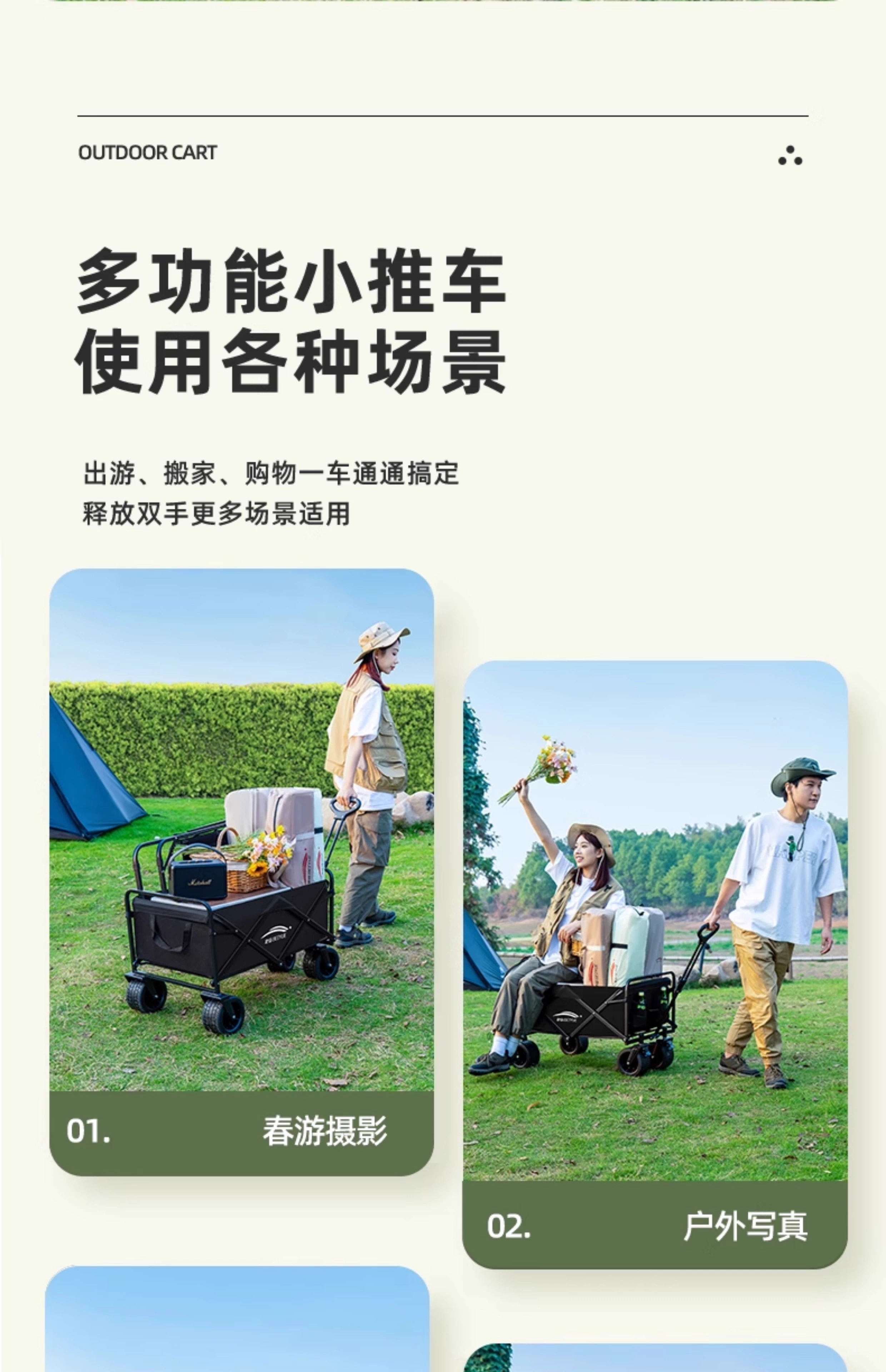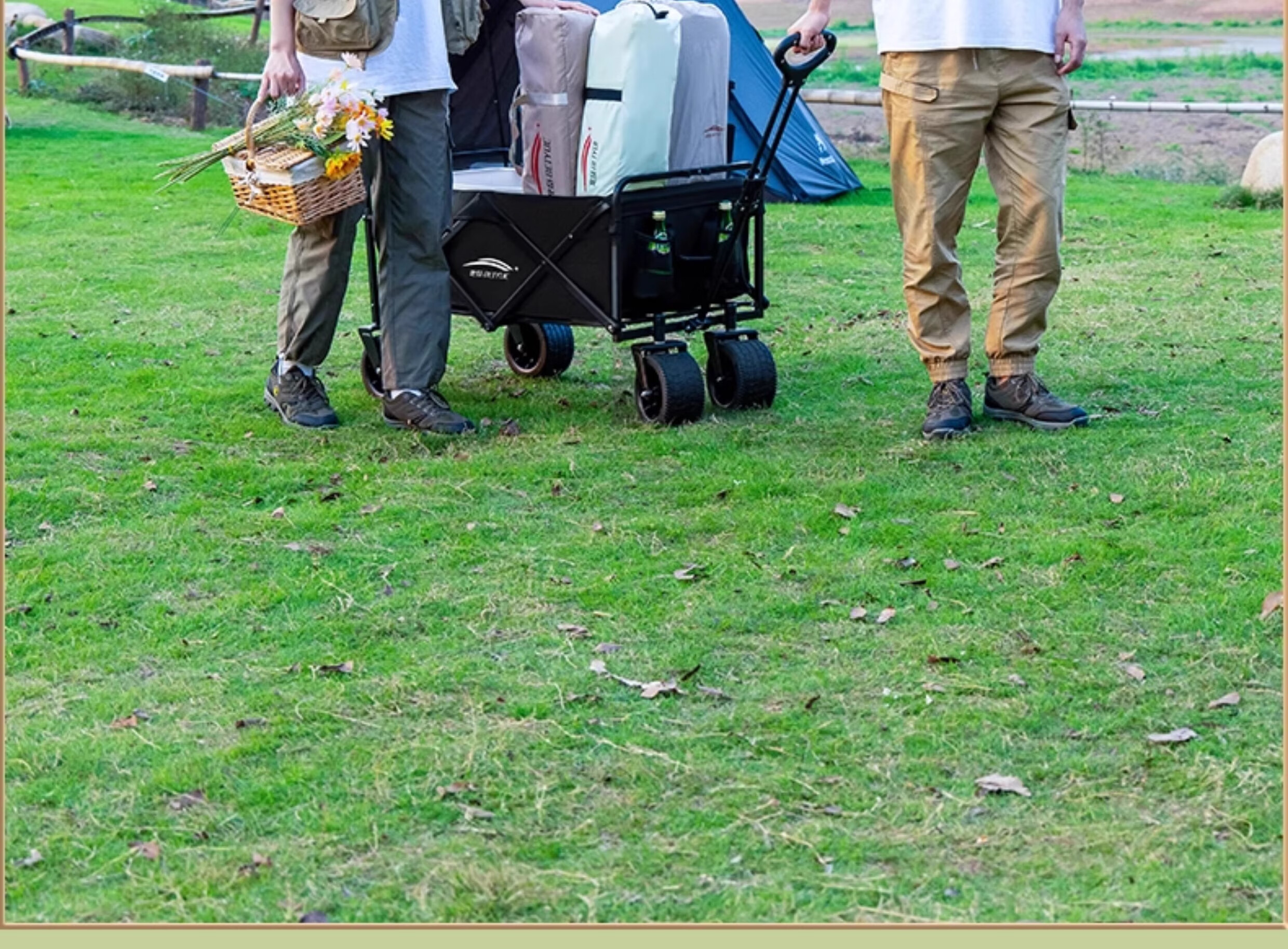 外观设计漂亮,尺寸大小合适,包装仔细完整,宝贝手感不错,感觉很好,发货速度快,服务态度一流,给力!5星好评!推车车轮很宽,质量很不错,转向也很灵活,质量很好,能放下我的帐篷还有折叠桌椅。非常适合户外活动时候装东西。