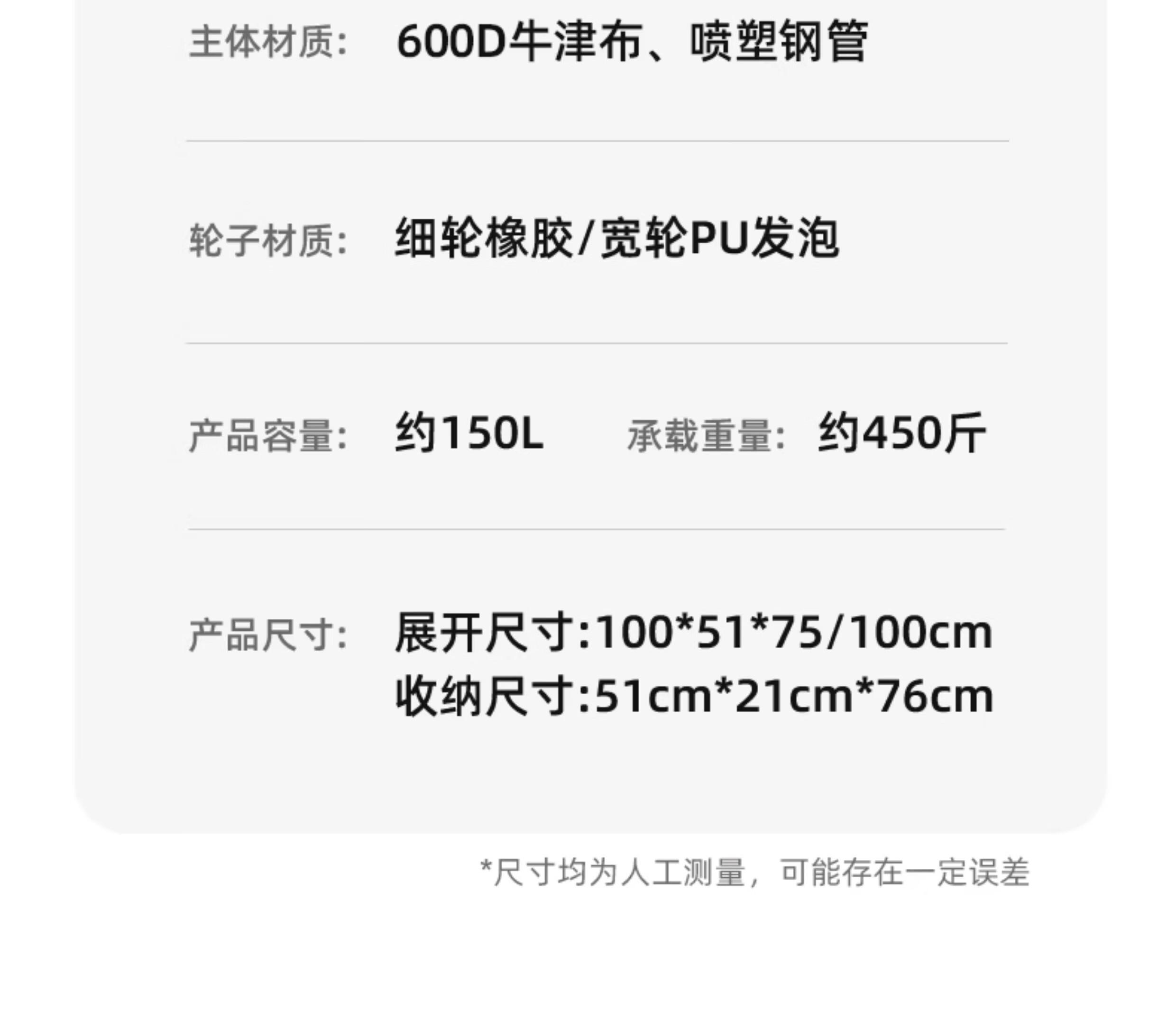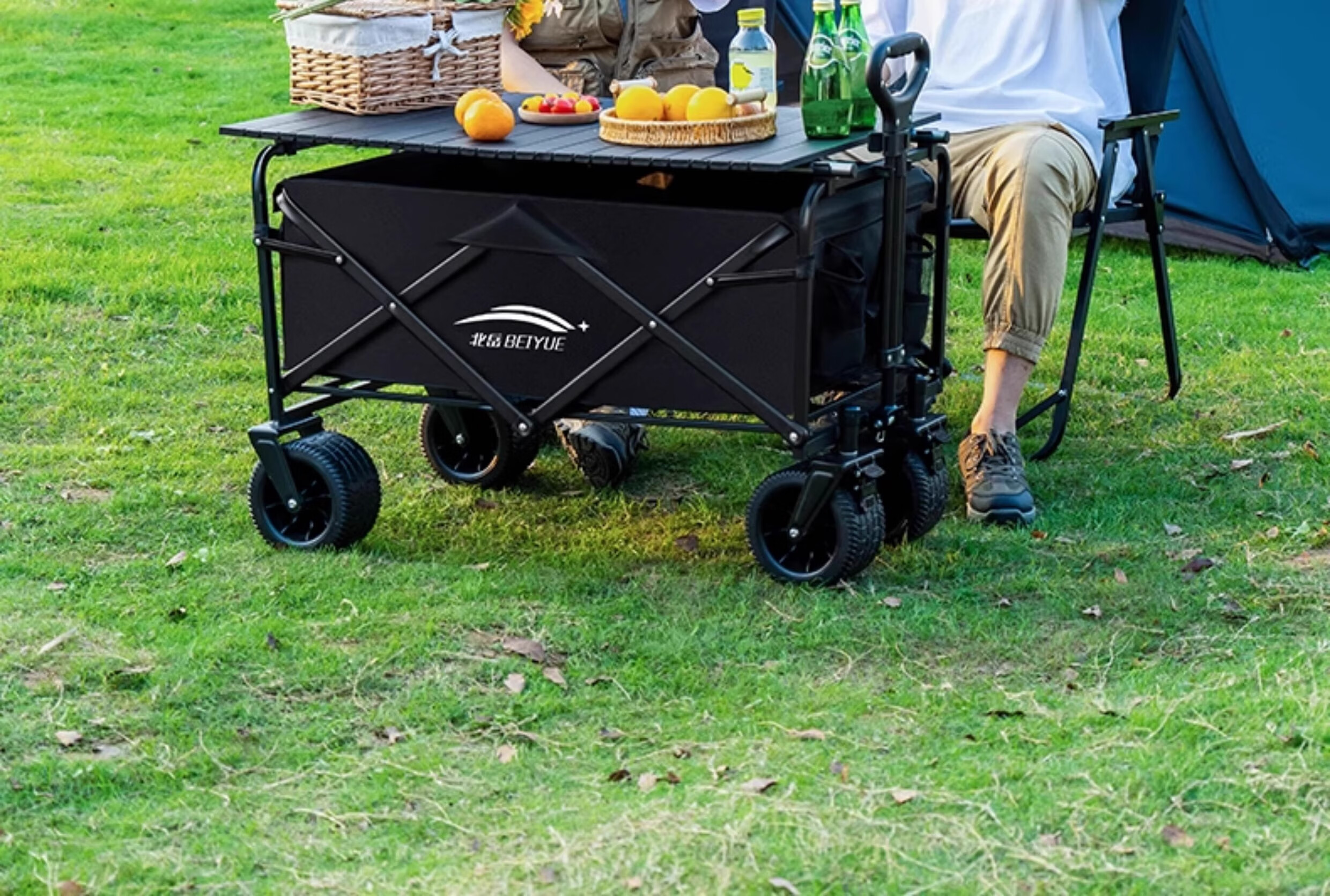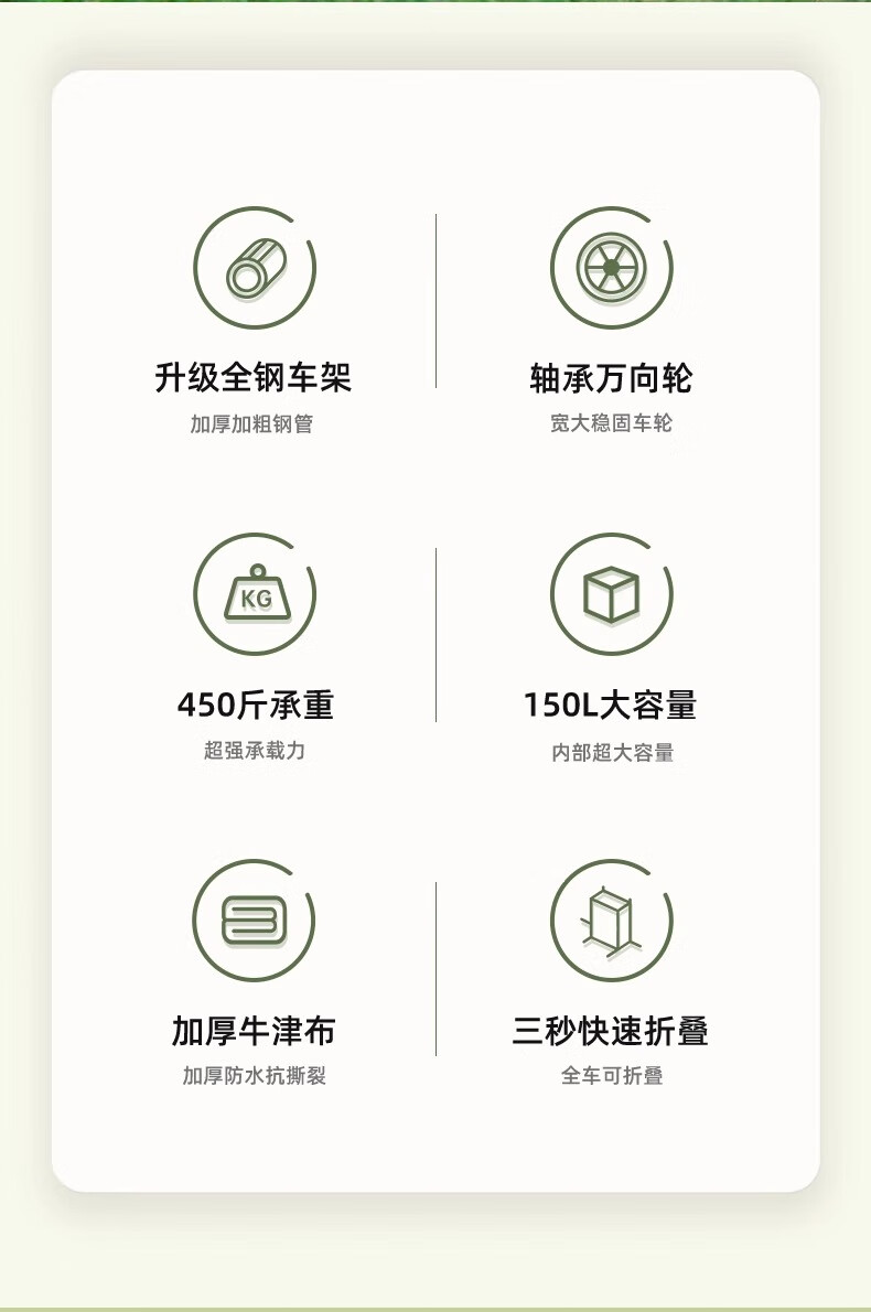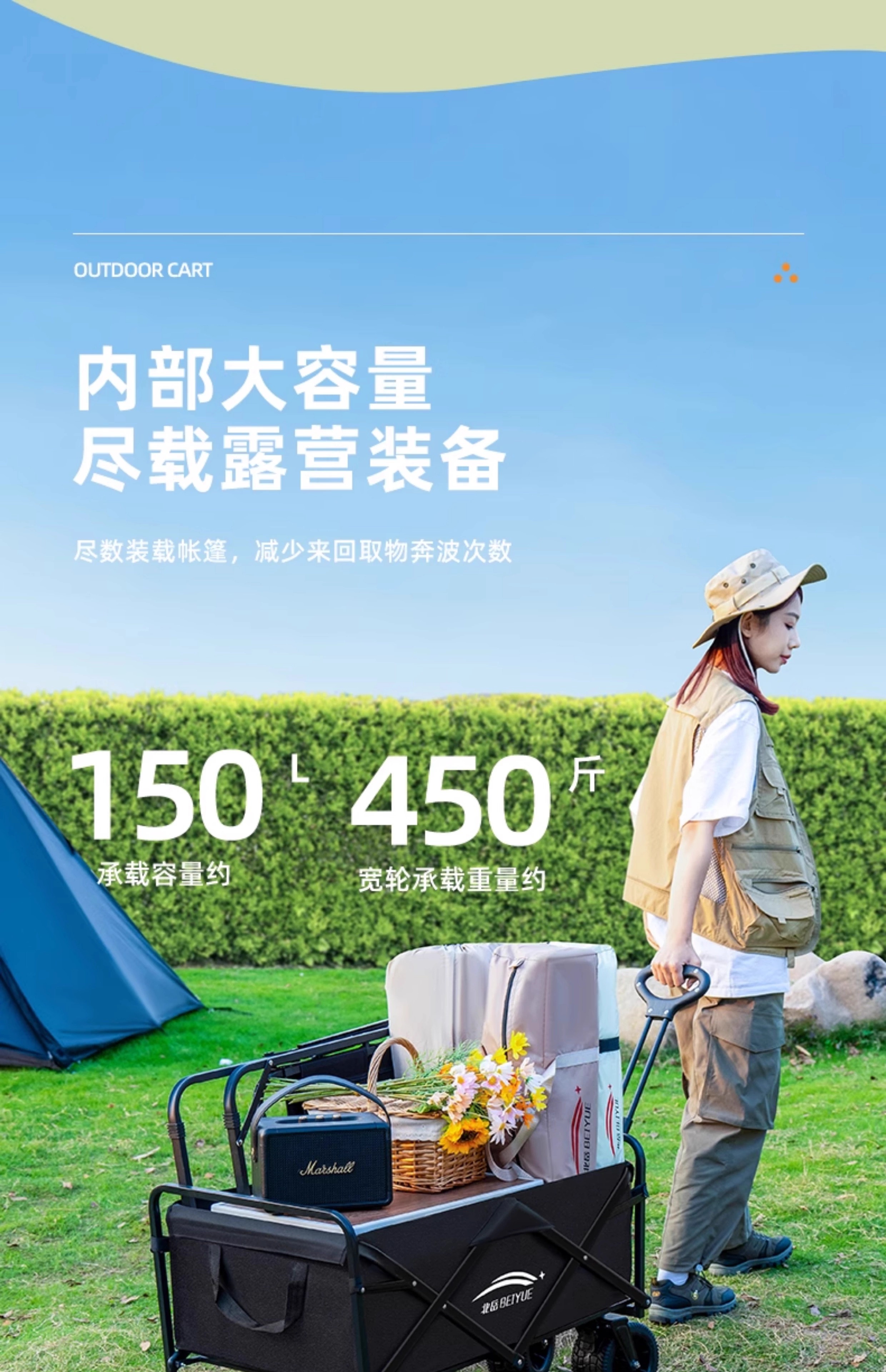 外观设计漂亮,尺寸大小合适,包装仔细完整,宝贝手感不错,感觉很好,发货速度快,服务态度一流,给力!5星好评!推车车轮很宽,质量很不错,转向也很灵活,质量很好,能放下我的帐篷还有折叠桌椅。非常适合户外活动时候装东西。