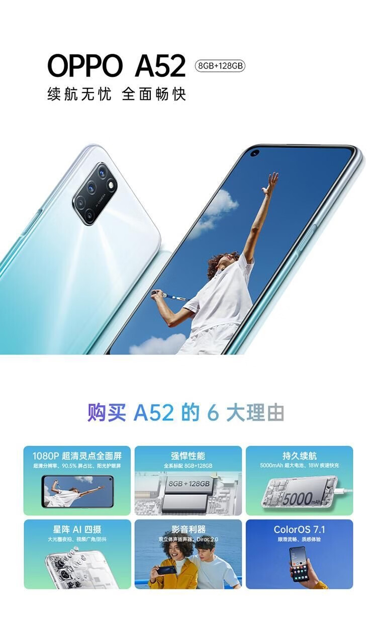 OPPO A52 智能拍照高清四摄5000大电池工作室热门游戏流畅手机 黑 8+128GB x 4G全网通 x 标配 x 2
