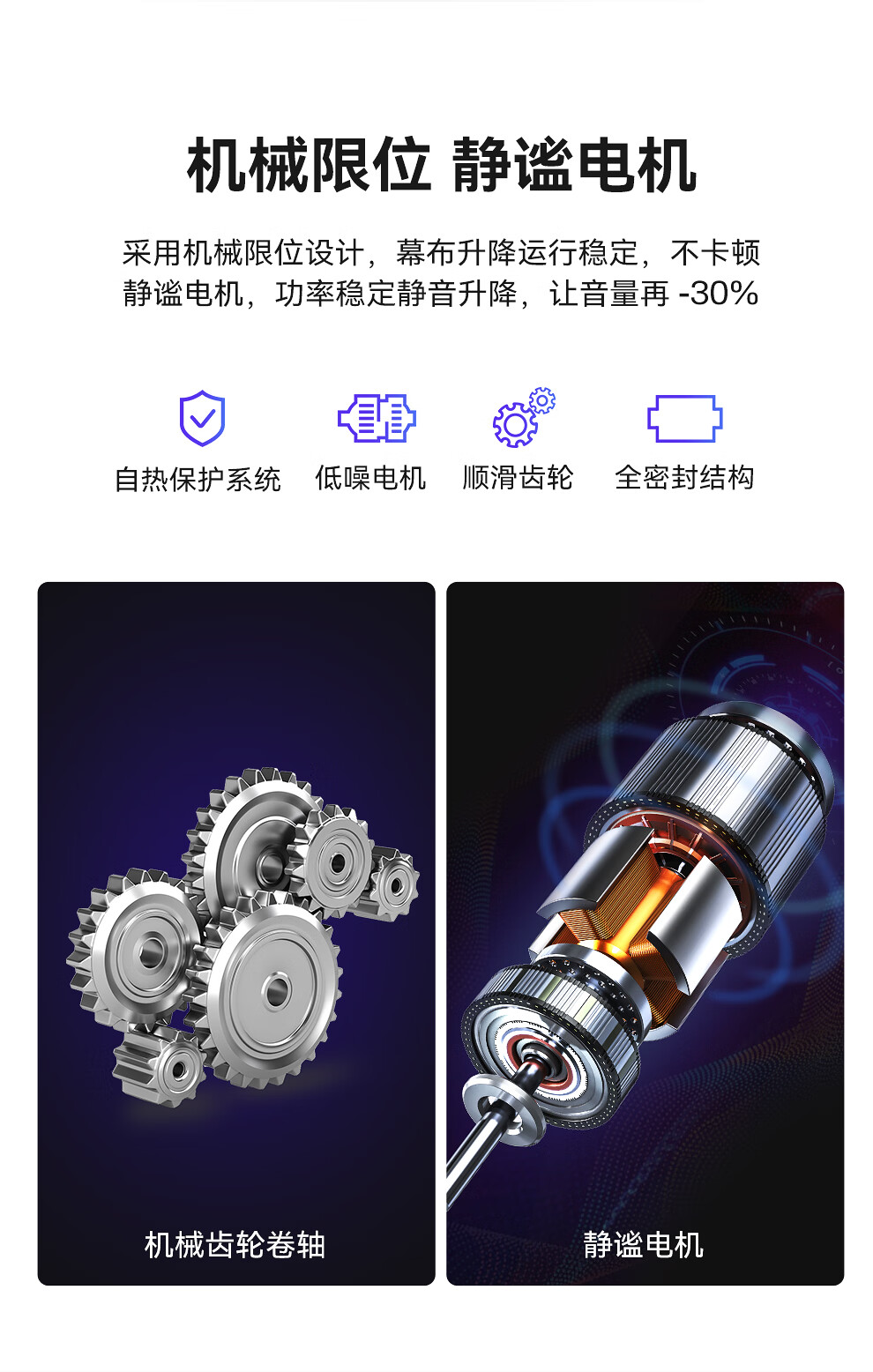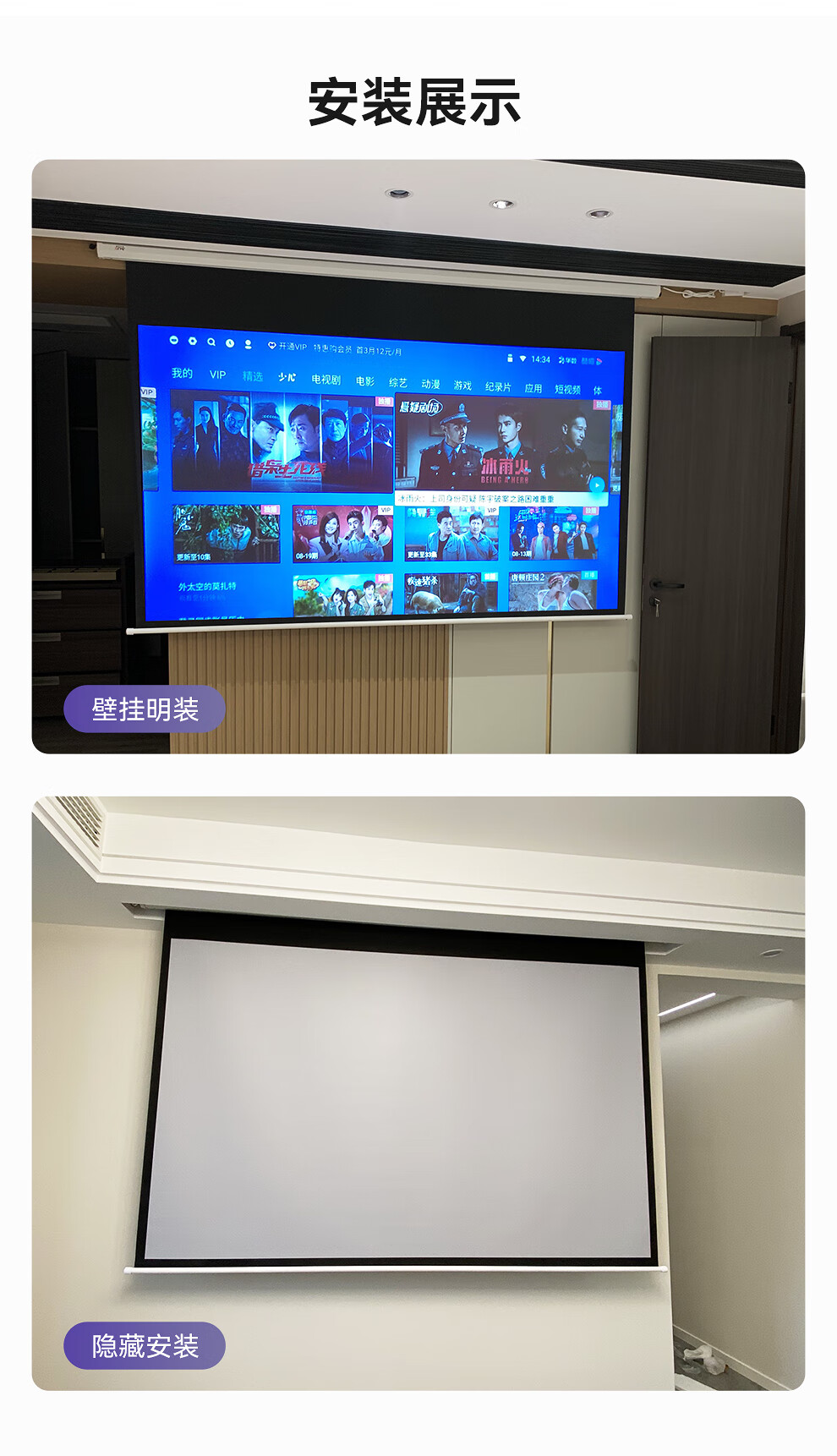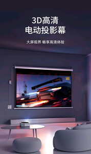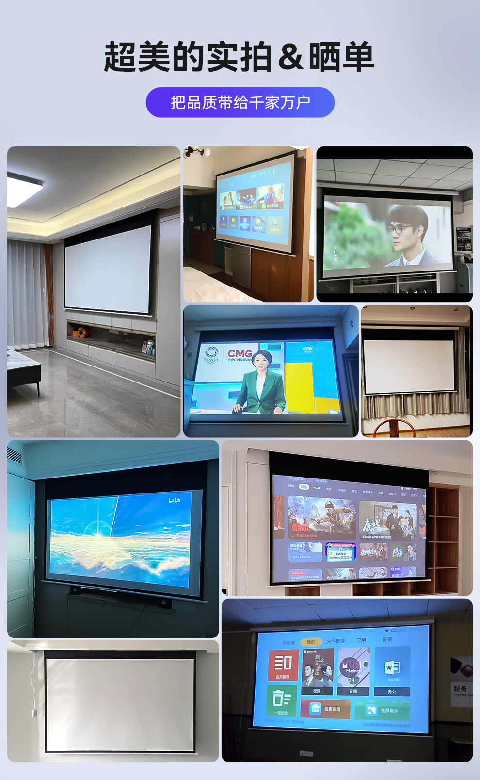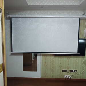 此款屏幕非常的不错,安装简单,双向通电这个一个亮点是值得肯定的非常的方便哪头用不到还有个盖子盖住防止误碰,屏幕非常的大,极具性价比,电动的方便不用的时候完全能收上去,不遮挡电视机,电机响声可以接受,不知道寿命怎么样展开比较平整没有折痕。非常的不错。电机如商家宣传的话那就完美了。对于清晰度的增幅没有感觉到。买这个纯属为了不用时不要遮挡电视