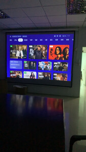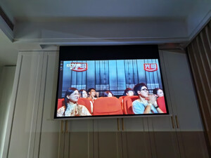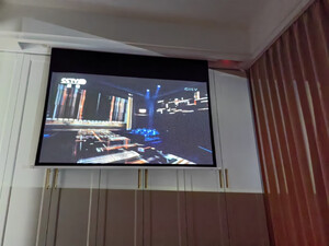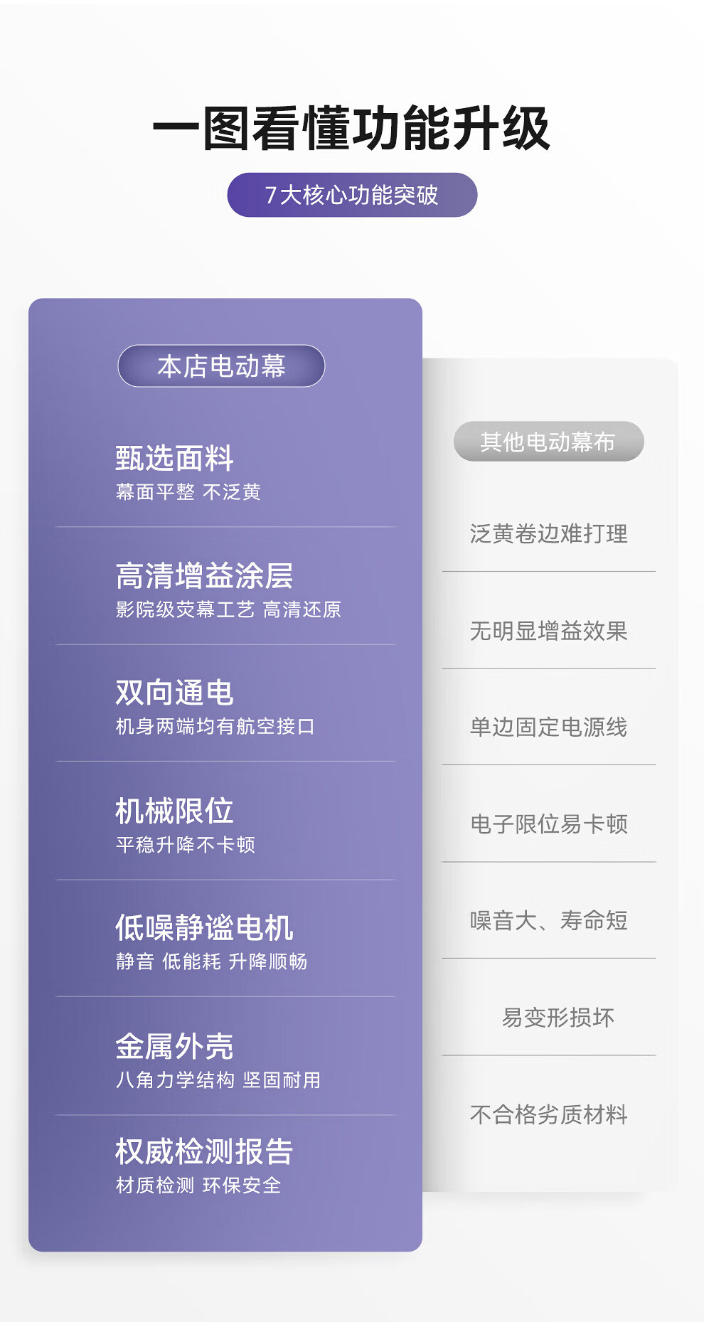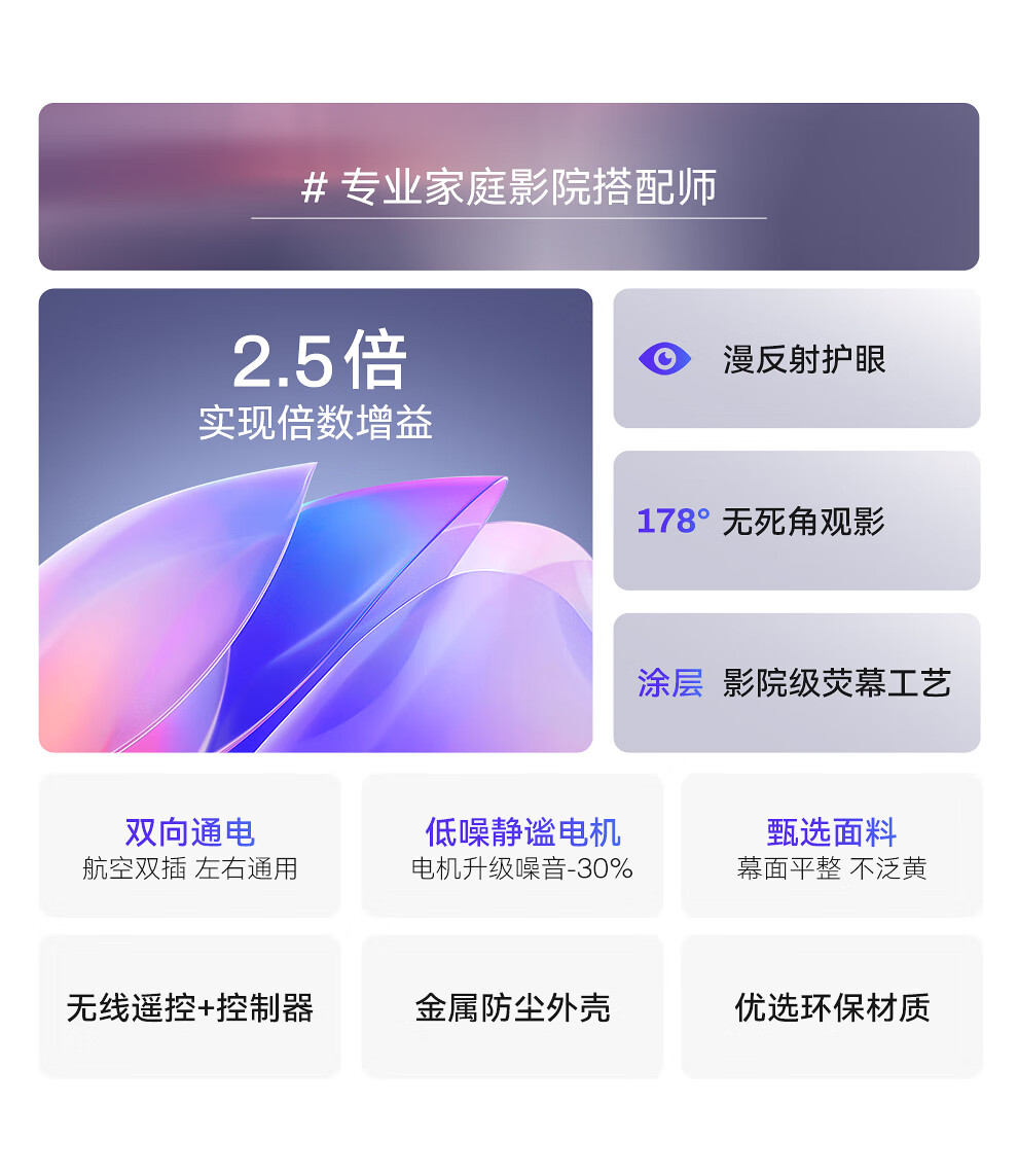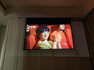 此款屏幕非常的不错,安装简单,双向通电这个一个亮点是值得肯定的非常的方便哪头用不到还有个盖子盖住防止误碰,屏幕非常的大,极具性价比,电动的方便不用的时候完全能收上去,不遮挡电视机,电机响声可以接受,不知道寿命怎么样展开比较平整没有折痕。非常的不错。电机如商家宣传的话那就完美了。对于清晰度的增幅没有感觉到。买这个纯属为了不用时不要遮挡电视