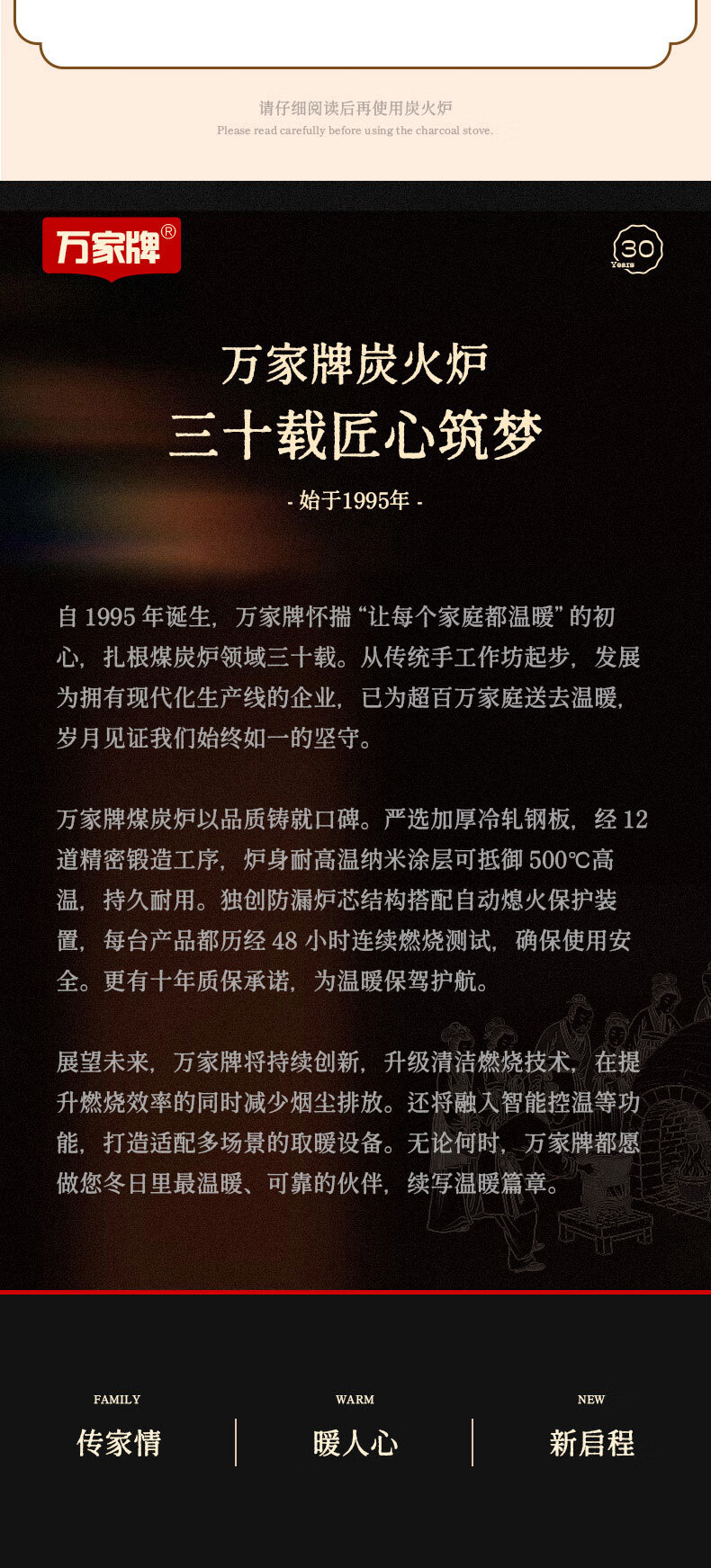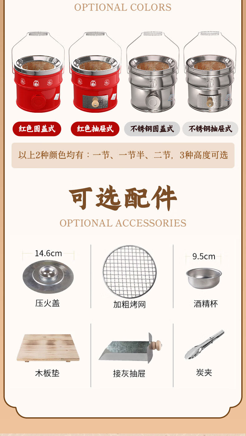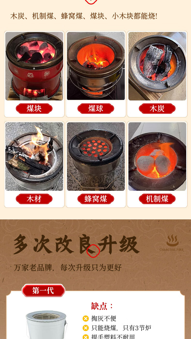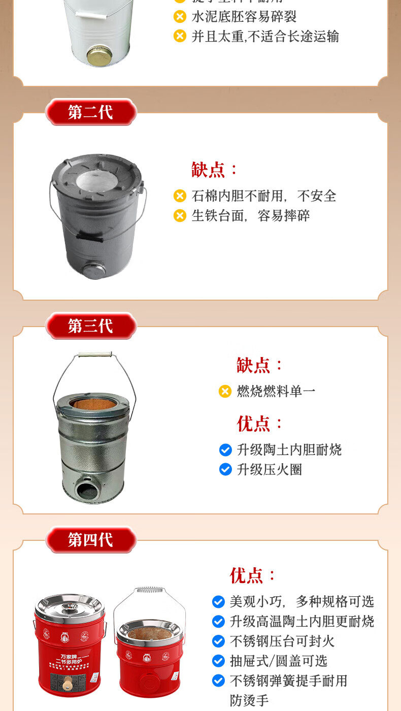万家(WANJIA)一节二节多功能煤炉烤火炉煤球炉取暖手提移动户外新款炭炉 抽屉式红一节【内径14cm】+压火盖