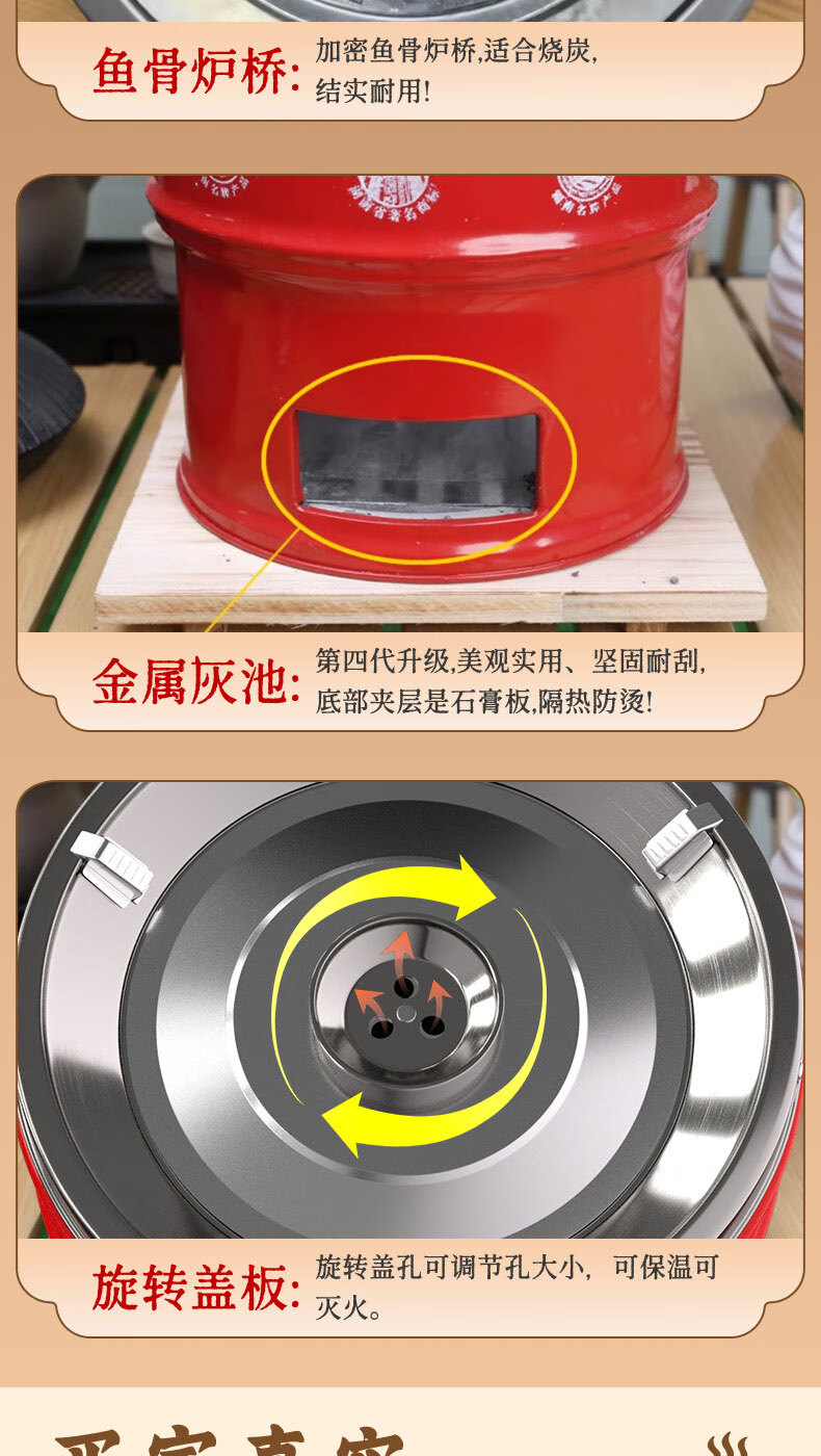 万家蜂窝煤炉烤火取暖炉庭院围炉煮茶烧烤碳炉户外便携炉具炭火炉 红色一节半抽屉款炭火炉+压火盖