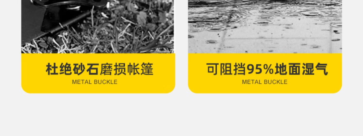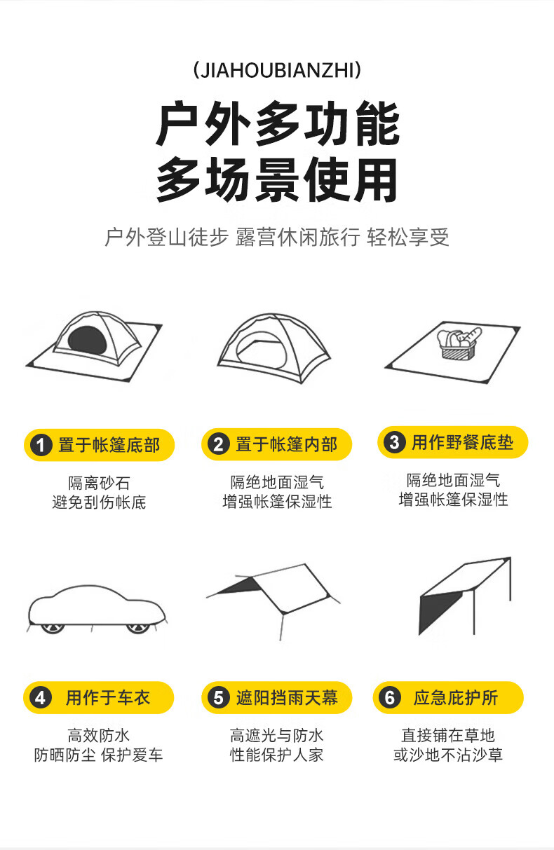 加厚材质,防水防潮效果佳。表面凹凸纹路防滑耐磨,收纳轻巧便携。四季适用,隔离地面湿冷,睡眠更舒适。贴合帐篷底部,尺寸适配主流款式。性价比高,适合家庭露营或徒步使用,推荐搭配帐篷提升防护性。