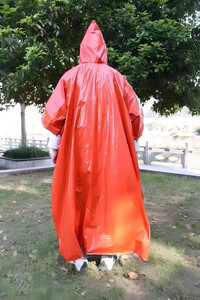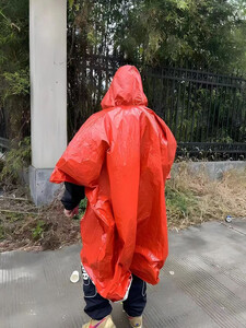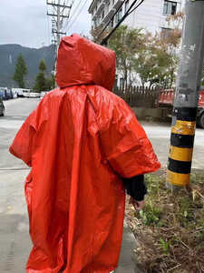 之前买的是应急毯,而这种应急雨衣不仅是结合了应急毯的保温功能还多加了防雨功能。喜欢旅行又想在应急装备了添加就买了。这款应急雨衣颜色鲜艳,鲜橙色很打眼,如遇突发状况一眼就可以看见。试用了一下,很快就感觉到热,具有保温功能。