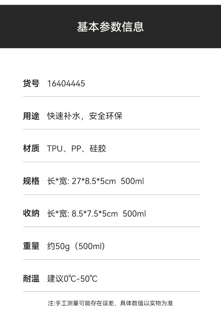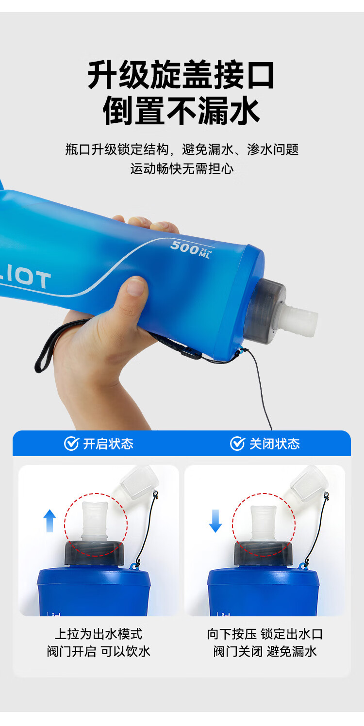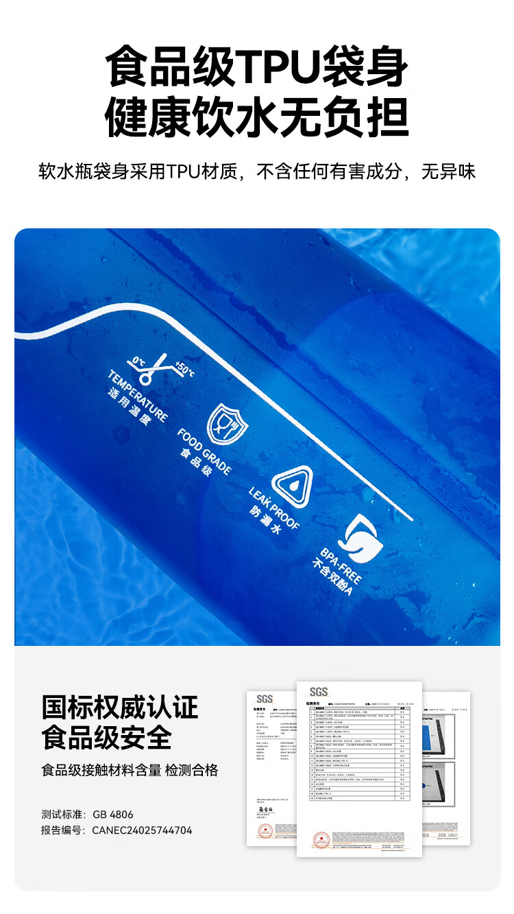 它的便携性简直绝了!采用可折叠设计,不用的时候轻轻一压,就能变成小小的一团,轻松塞进背包的角落,完全不占空间。需要用水的时候,一拉一撑,立马恢复原状,就像变魔术一样,随时随地都能为你补充水分。 材质也是相当靠谱!选用食品级安全材质,无毒无味,就像给你的嘴巴和身体都上了一层“安全锁”。而且密封性超强,不管你怎么晃动、挤压,都不会漏水,让你在户外运动时毫无后顾之忧。 不管是跑步时的大汗淋漓,还是登山徒步时的口干舌燥,有了这个软水袋,就像随身携带了一个移动的“小水库”。随时都能喝上一口清凉的水,瞬间恢复活力,继续征服前方的道路! 这么一款集颜值与实力于一身的户外软水袋,只需30元,就能把它带回家!宝子们,别再犹豫啦,赶紧入手,让它陪你一起开启精彩的户外之旅吧!