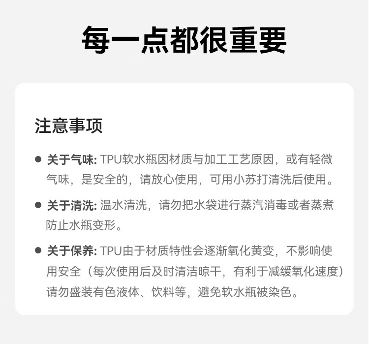 买来跑步用的,这个小水袋太方便了!很轻,随便塞裤兜里都行。折叠起来就鸡蛋大小,展开能装不少水。材质没异味,出水也顺畅。户外必备小神器,推荐!