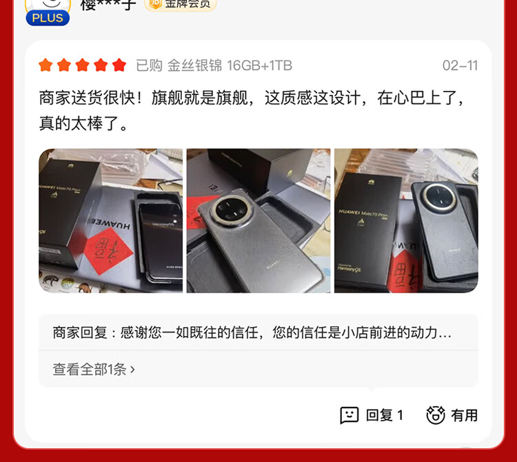 华为手机的老用户了,这次从Mate30换成Mate70pro+,是质的飞跃。新手机到手后第一时间感受到性能的巨大提升。 Mate70pro+外观大气典雅、运行丝滑流畅、拍照效果优秀,是一部性能优异的手机。 这家店铺大家放心购买整体下来都不错