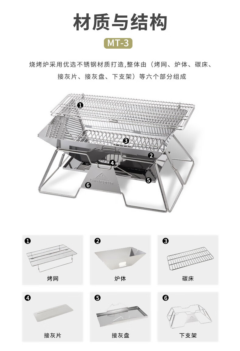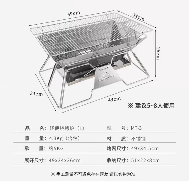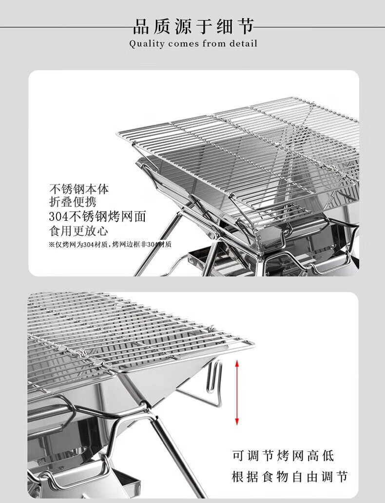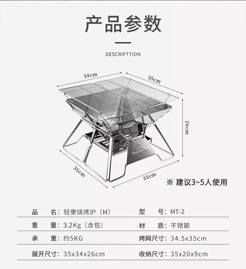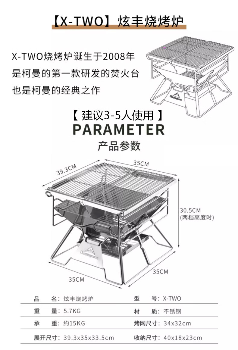 很𣎴愉快的一次购物,一年几次价格的变动,终于在差不多价格最高的时候买了一个(177元),收到货后,迫不及待的打开,炉体201𣎴锈钢,烧烤架不知道什么材料(好象是不锈钢但又不象304,无法检测),组装容易(可分六个步骤),室内室外(家里家外都适用),还送了一个收纳包和碳夹(质量很差很薄的那种碳夹和包),整个包和烧烤炉重量如说明书介绍的一样(4.3公斤),适用几个人就不好说了,三、四个人的量应该是接得上的,这个烧烤架做工很差(尺寸不标准,有缝大缝小的地方),看图,很失望,还以为大品牌,质量好,结果很糟糕