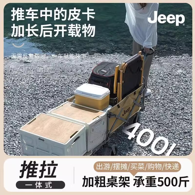 JEEP吉普露营车推拉一体户外野营装备手推车摆摊可折叠小推车加长拖车 卡其可推拉新款露营车 400L 有刹车