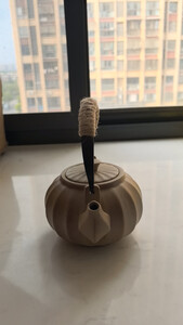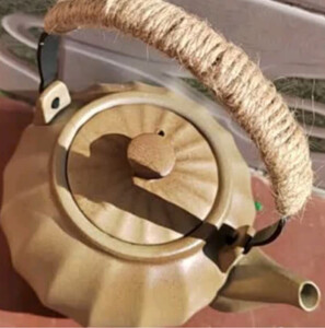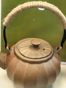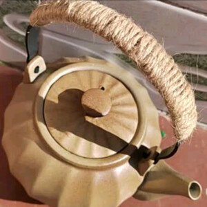 探险者围炉煮茶南瓜壶,外形看上去很漂亮,成南瓜造型,做工看上去还不错,壶壁很厚实,很坚硬,把手用麻绳缠绕,可以防止高温烫手。