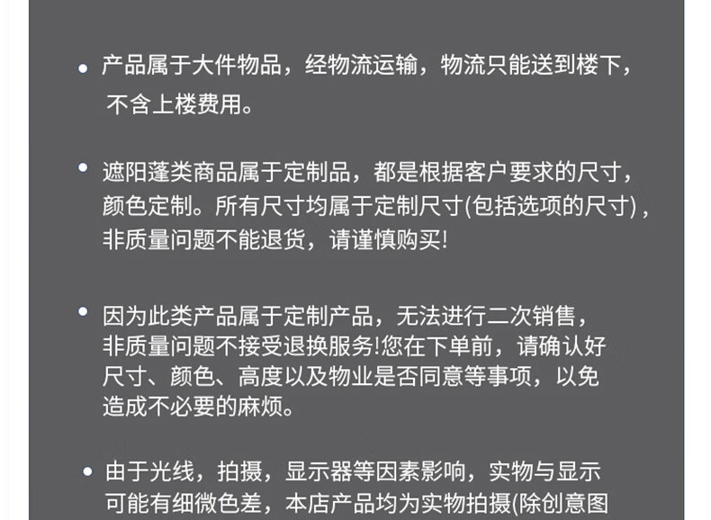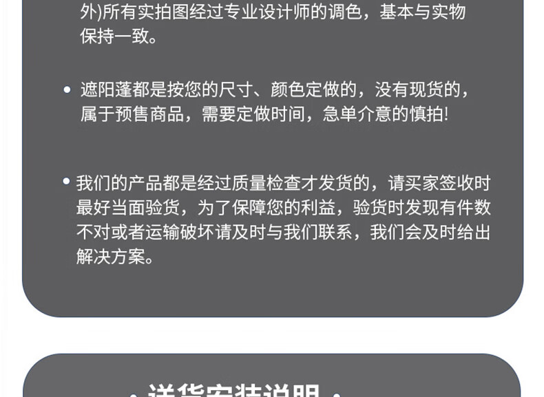 师傅测量专业细心,遮阳篷安装完很符合预期效果,实用性和颜值都很高,很满意的一次购物,邻居看到都在咨询!