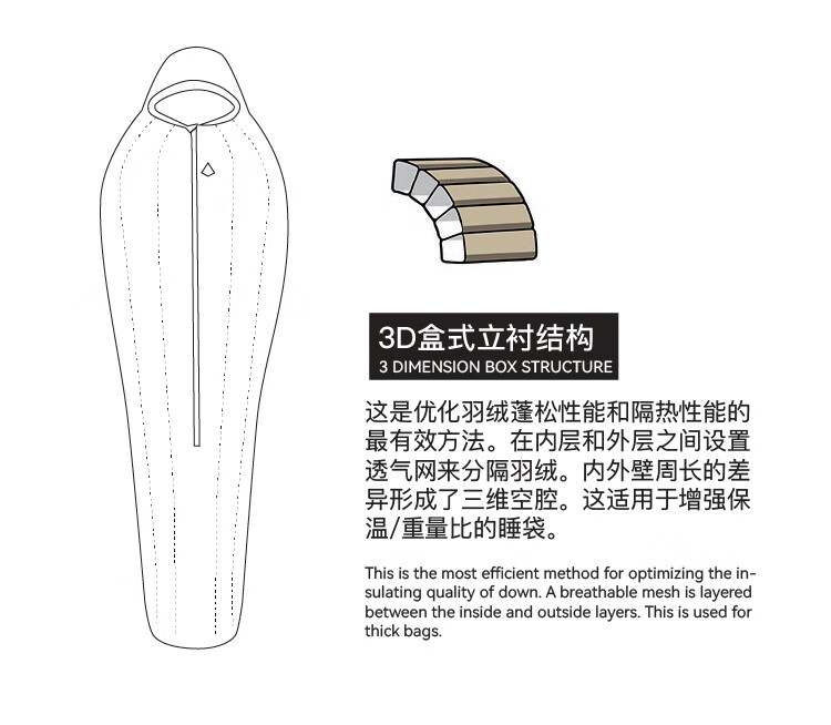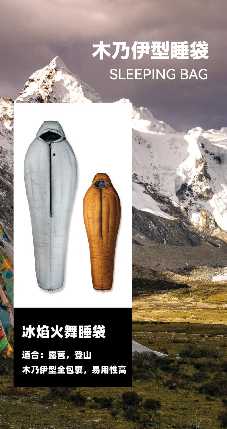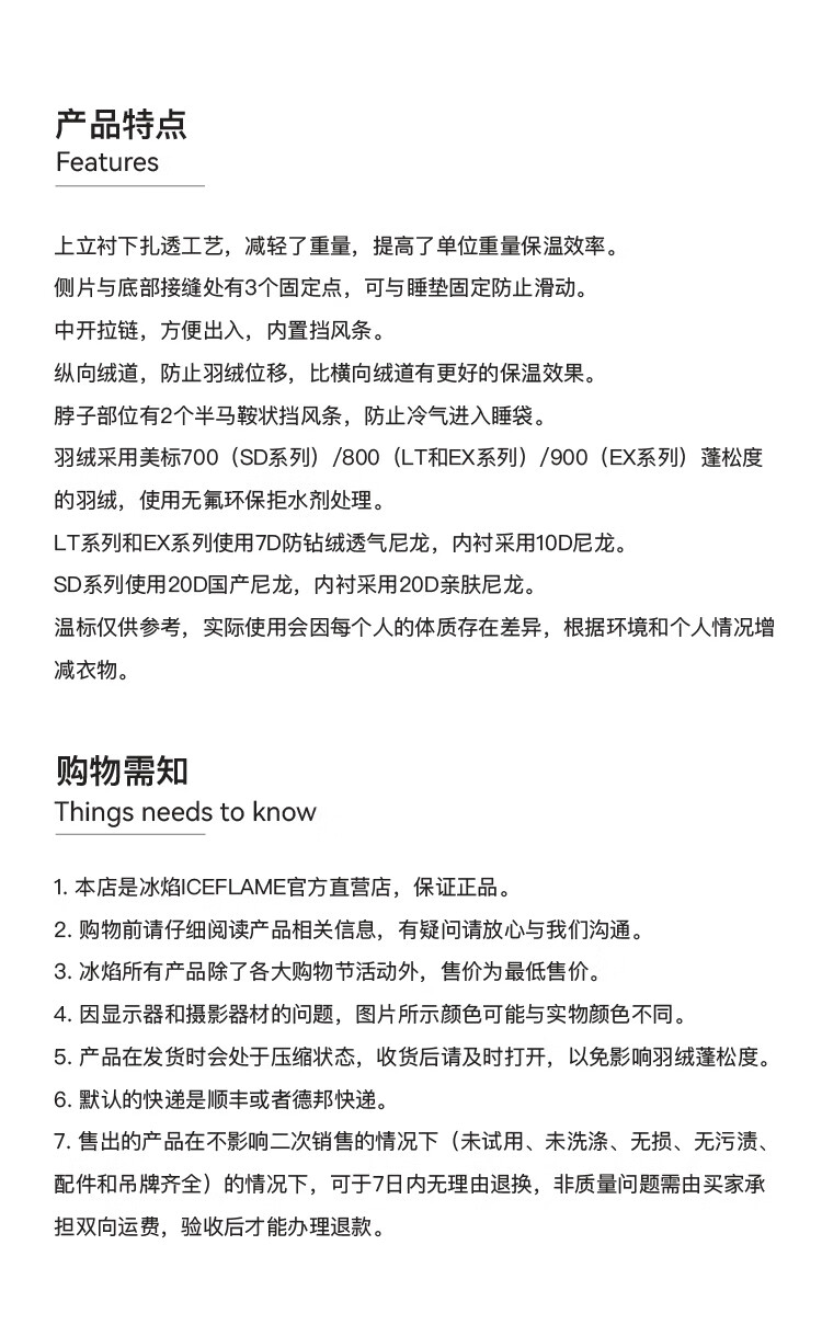 1. 包装:冰焰品牌纸箱、塑料袋等。2. 产品手册:提供相应的产品手册和无碳电子使用说明。3.防伪标识:一件一码,支持正品验货。4. 其他附件:睡袋收纳袋、信封、冰焰品牌售后卡、TPU修补贴、连接带。
