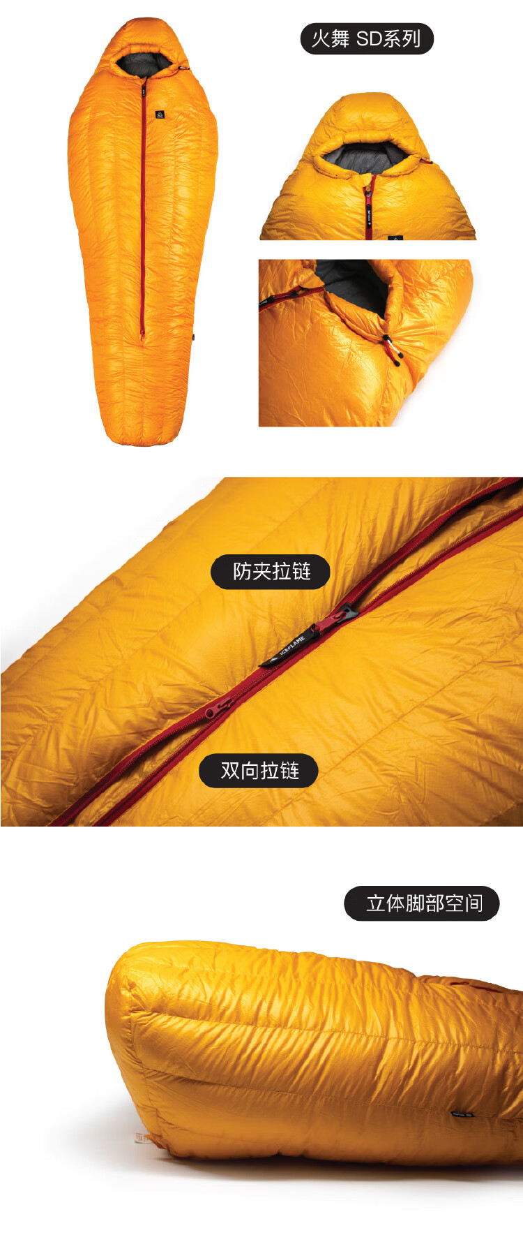 黄色鸭绒睡袋,颜色明亮。0 度使用很暖和,虽鸭绒有点气味但可去味。整体舒适,性价比高,值得拥有。