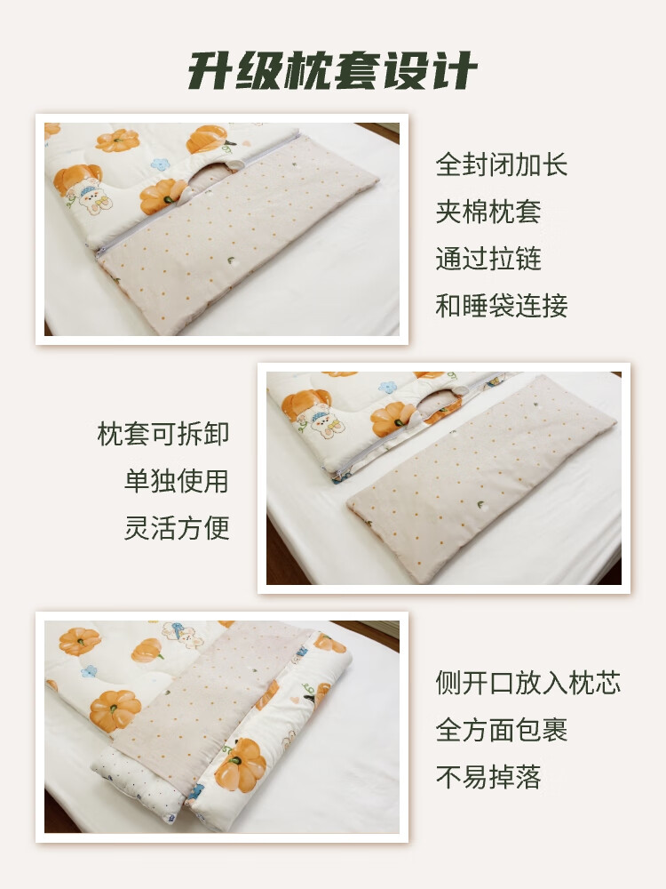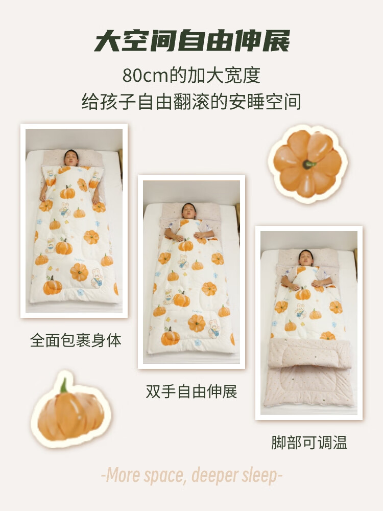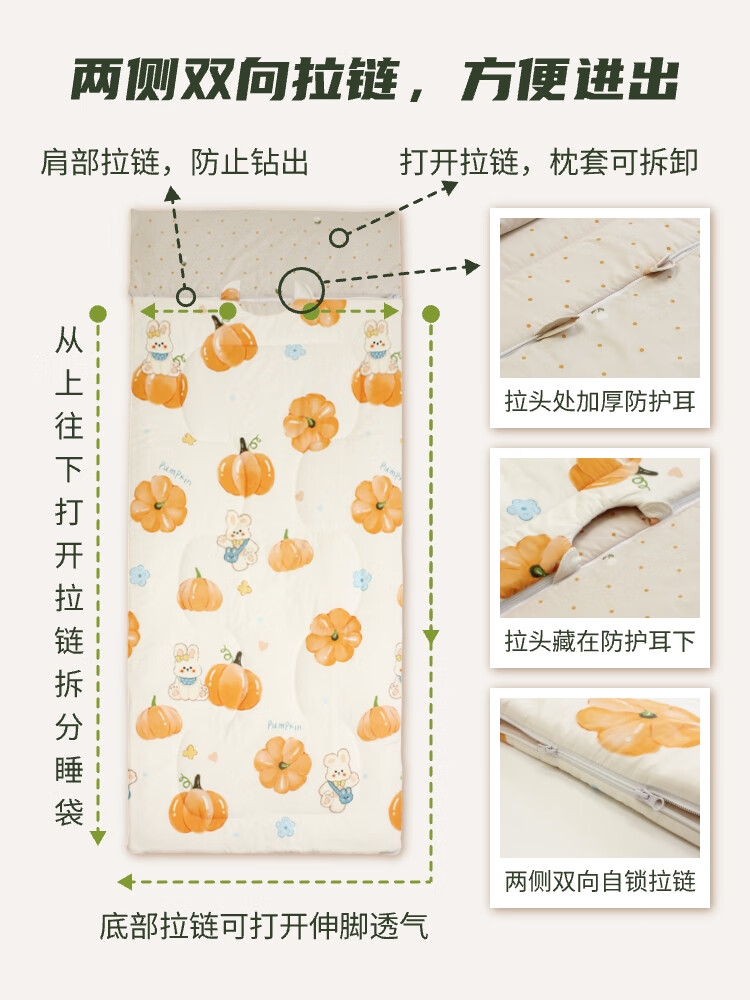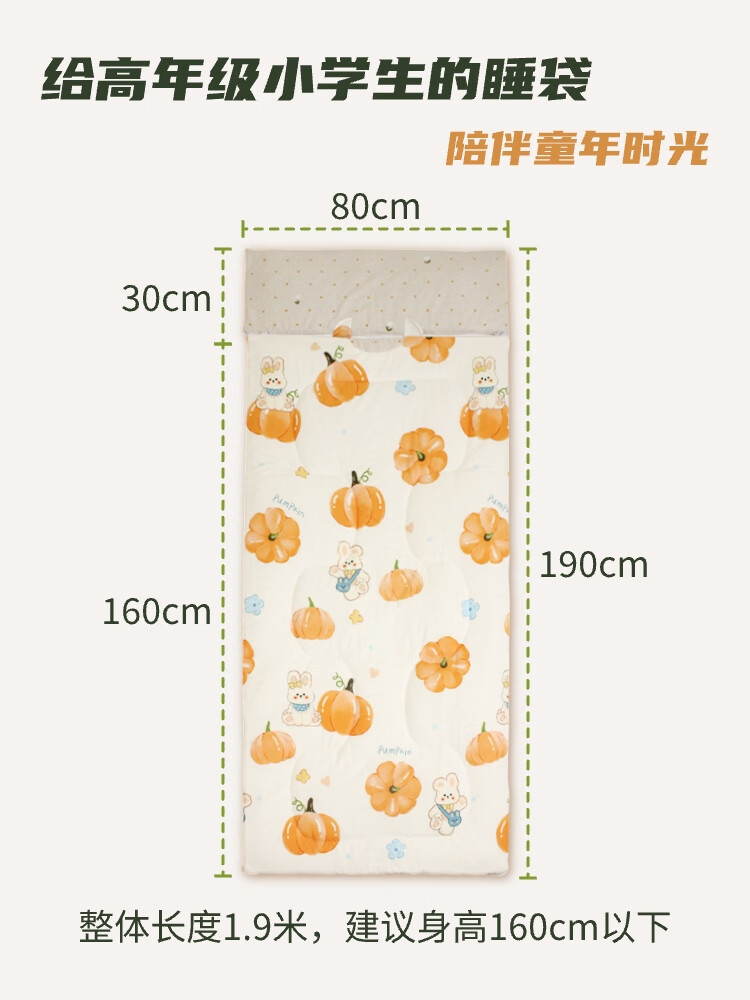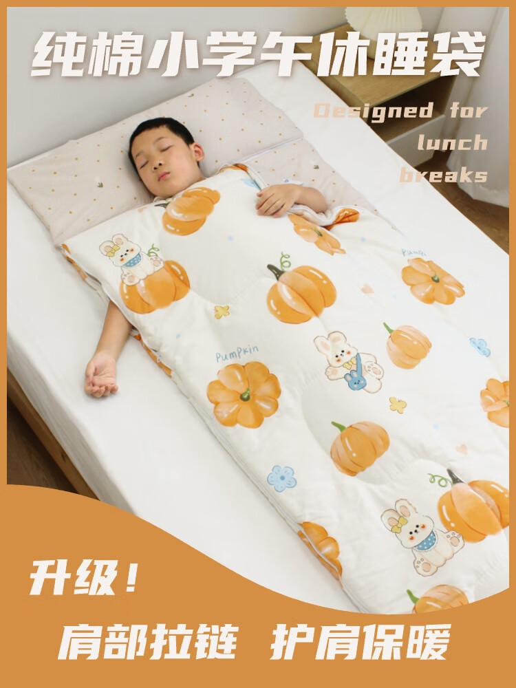 皓润琪纯棉儿童睡袋小学生午休睡觉大童一体式夹棉防踢被可收纳 南瓜贝贝 80*190春秋款