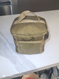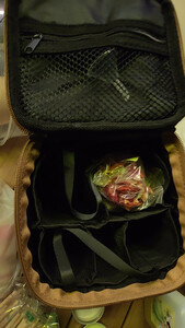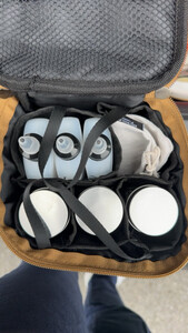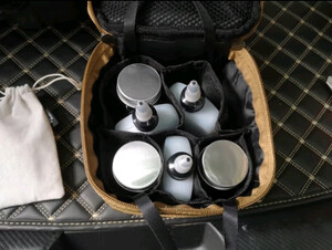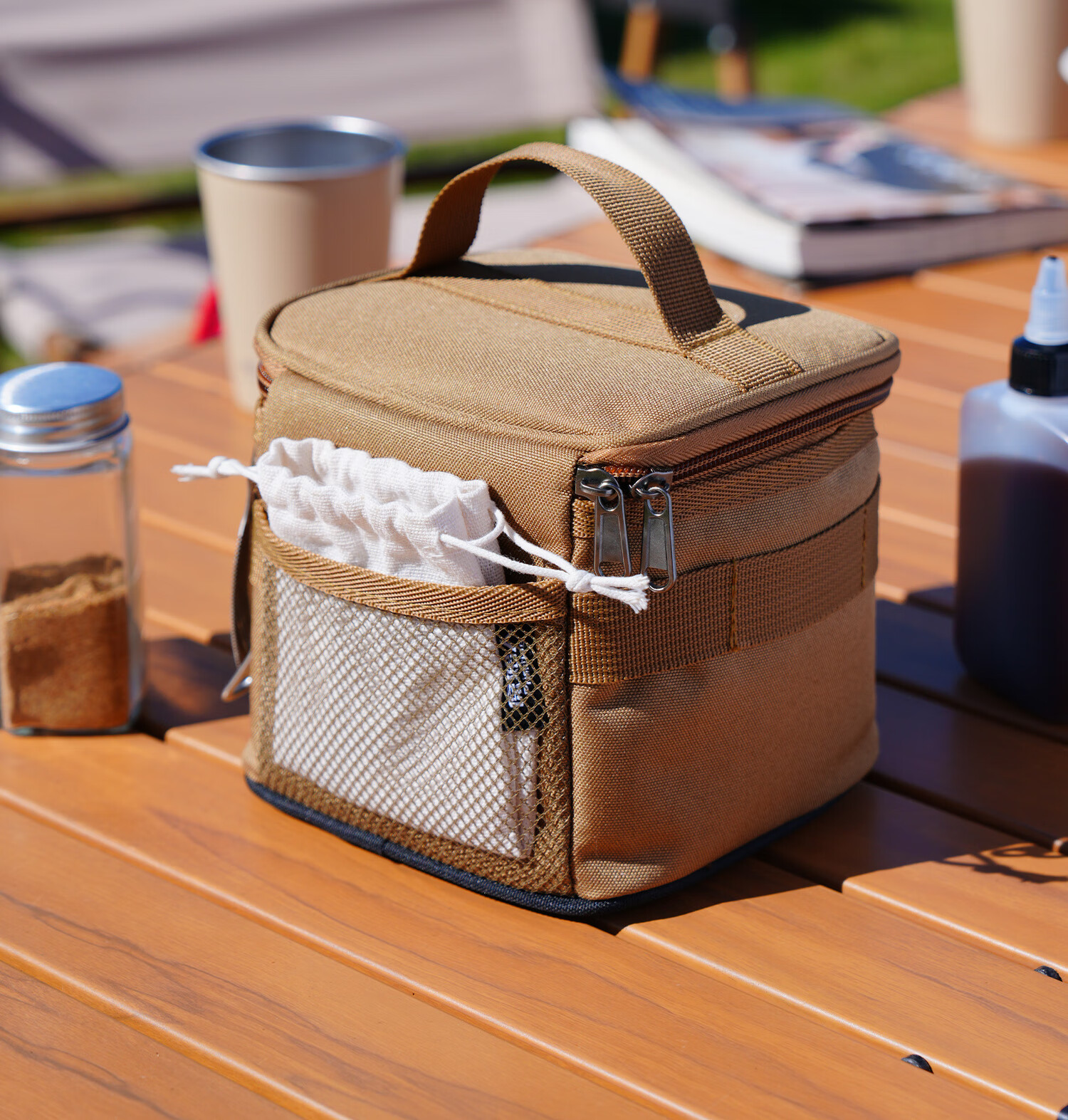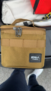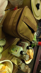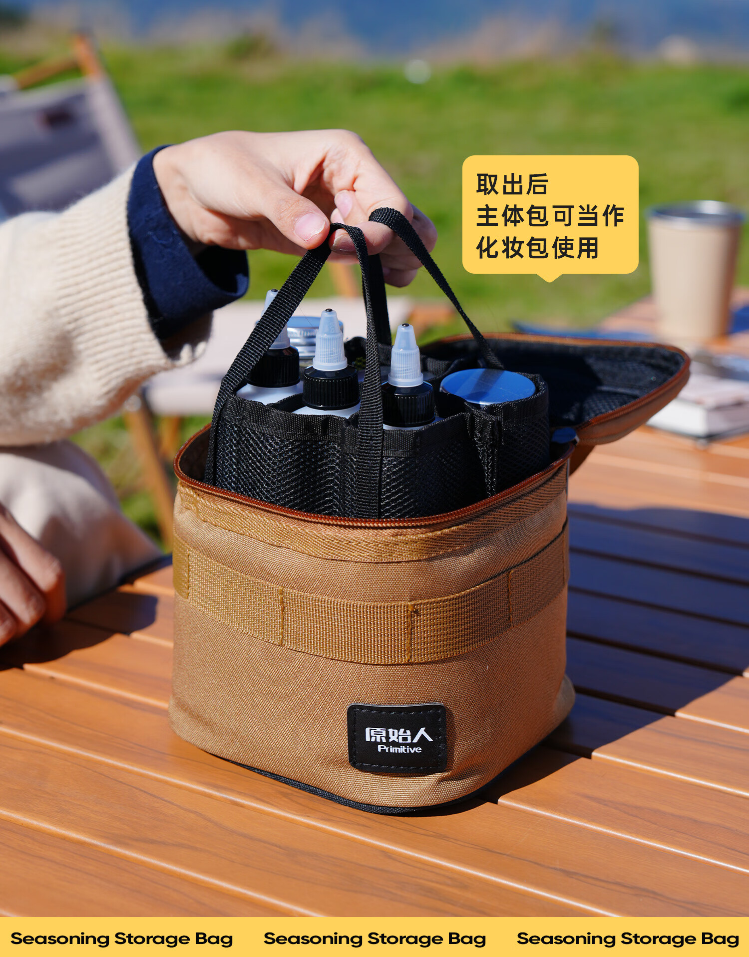 这是原始人的调味包,材质还算挺厚实。三个罐子,三个油瓶,带到户外刚刚好,很方便,一提就走。底层是防水面料,放到地面也不怕。