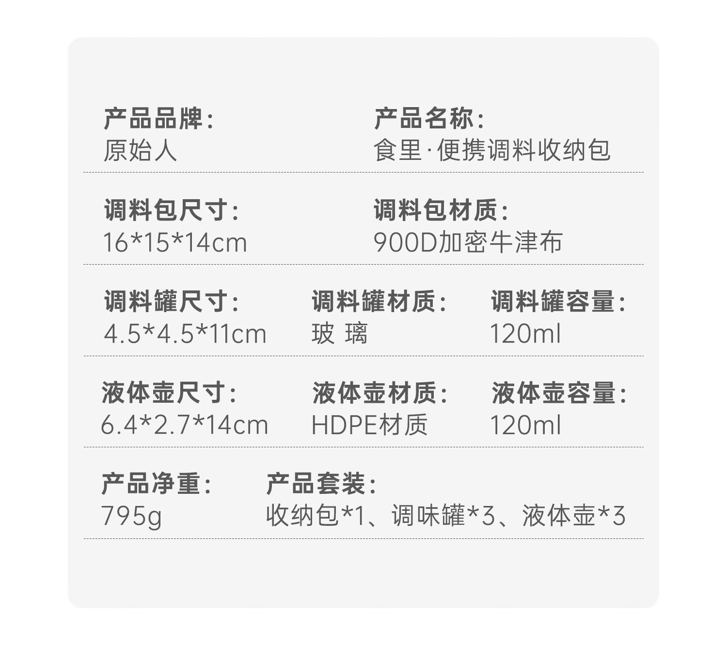 原始人调料包做工精细,整套野餐用具质量很好用料结实。价廉物美,户外用品原始人是不错选择,推荐购买。