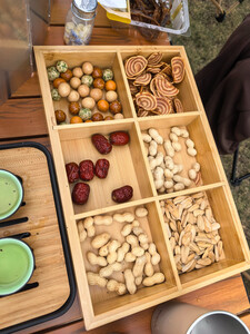 *****便携调料盒设计非常人性化,便于旅行时携带。每个小格子可放上各种调料器皿,野餐时的烹饪变得简单和有趣。材质耐用易清洗,配的餐具质感不错,商家服务好,值得信赖和推荐。