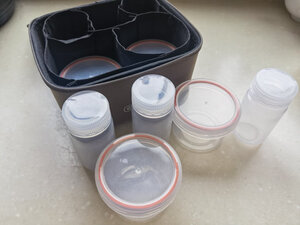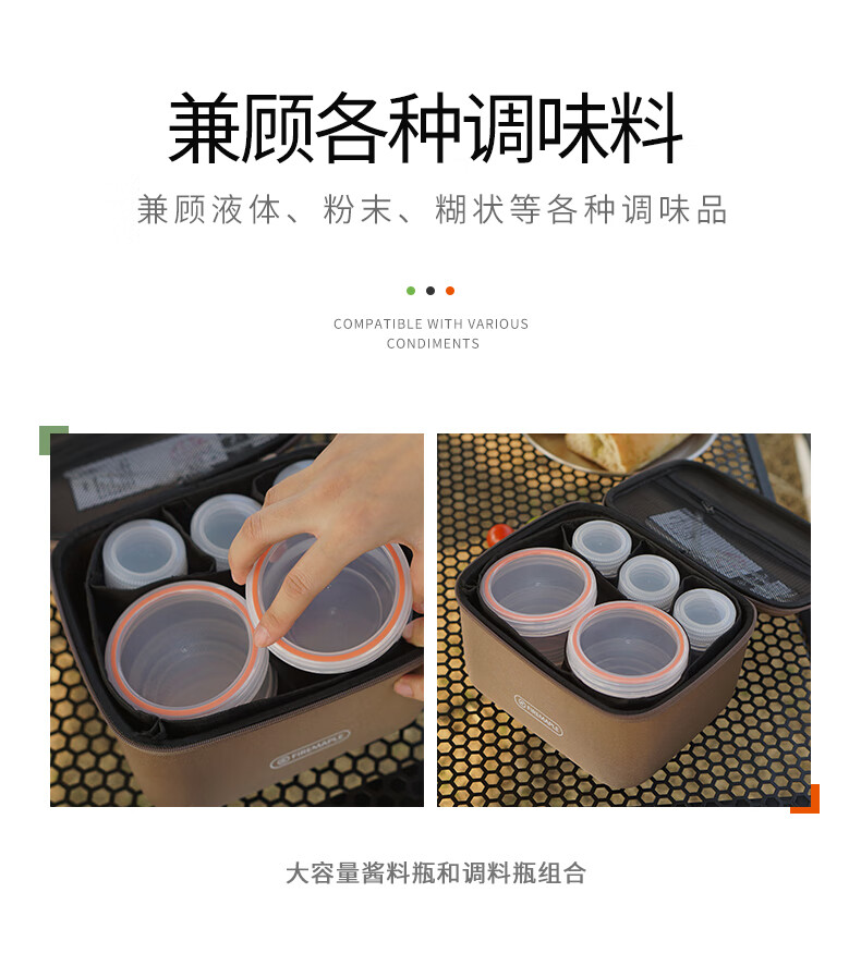 嗯,这款户外调料瓶嗯不错,做的也挺稀方的。嗯,特别是那个小小盒子,收纳也很方便呃总共有三个树的小瓶有六个那个方的要漂亮我觉得挺好的收纳一方面呃也没有什么异味