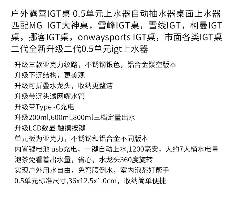 魔国户外智能触摸上水器IGT桌配件露营抽水器自动水龙头0.5单元亚克力板 0.5单元铝合金实心板黑色上水器