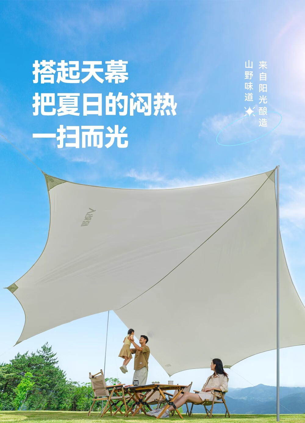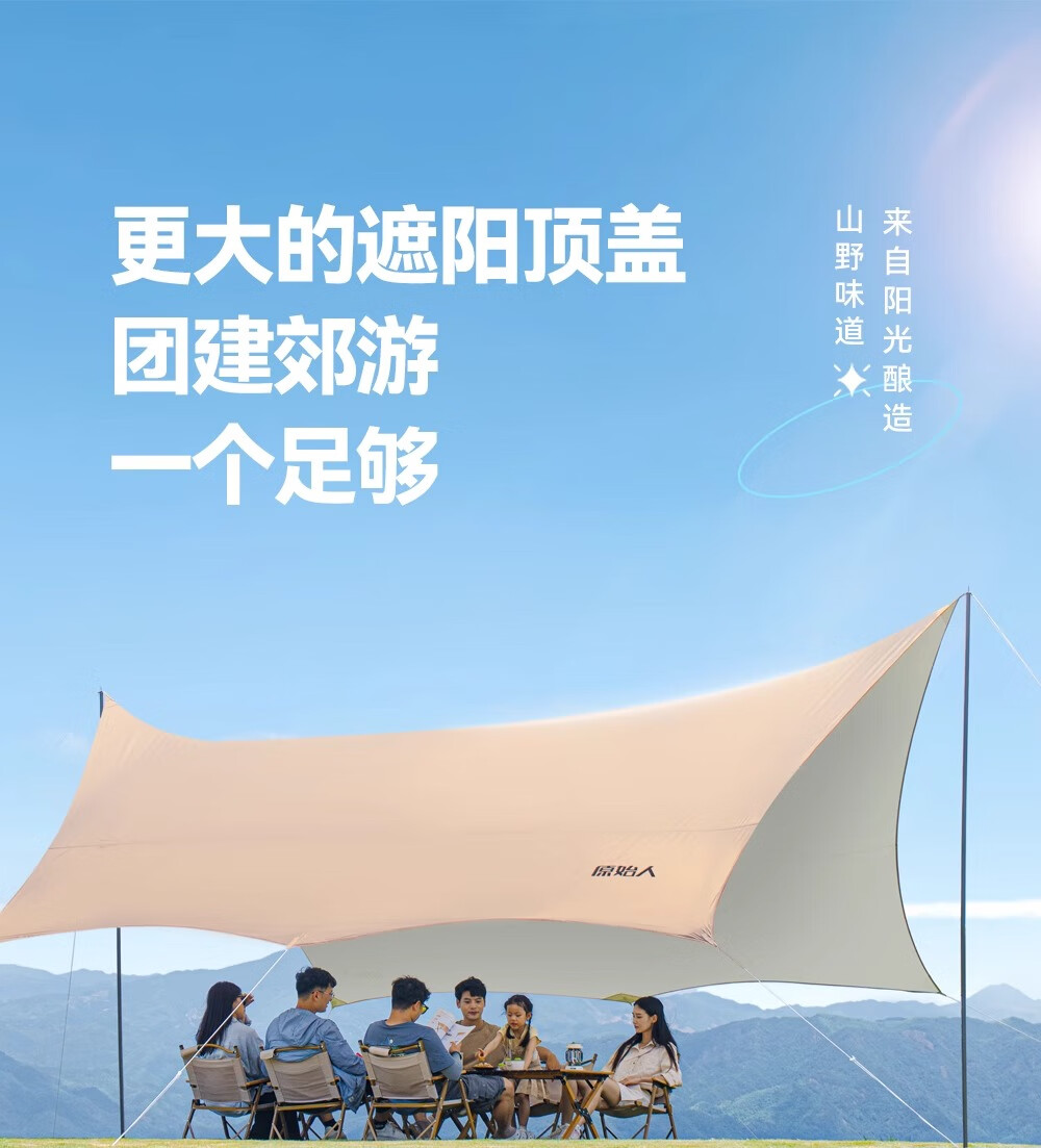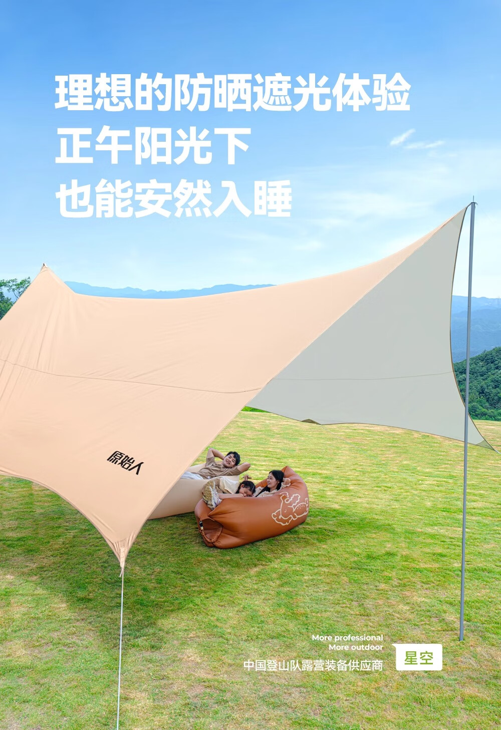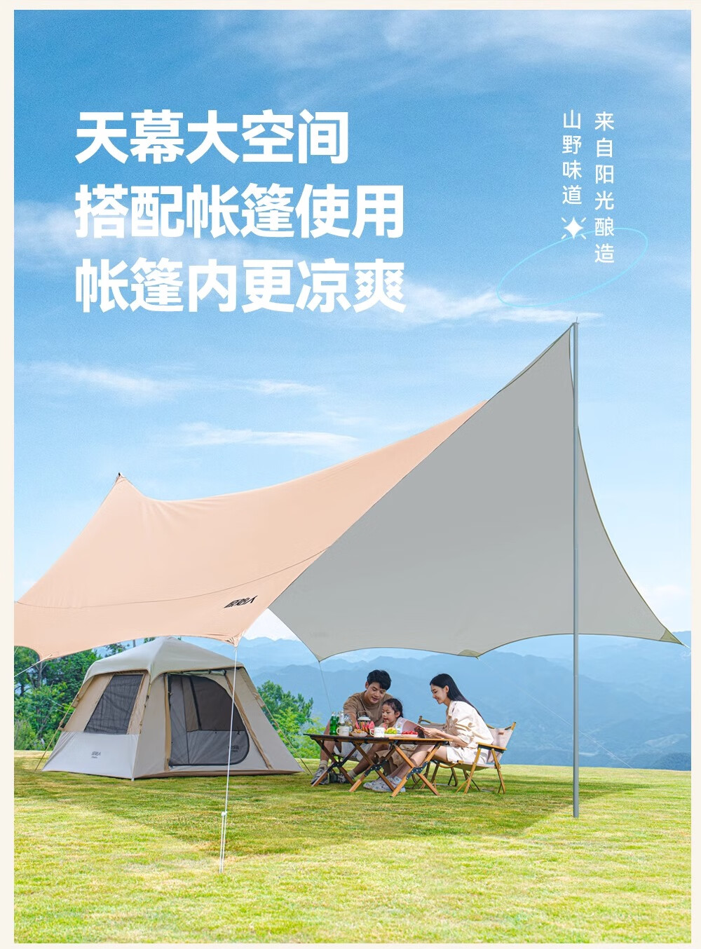 天慕不错,防晒效果很好,头一次买露营装备,在网上对比了好多品牌,最终选着了原始人,没有让我失望,6个小朋友在天慕下面玩,还有几个大人,空间也挺大的。