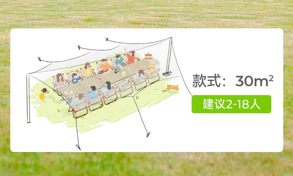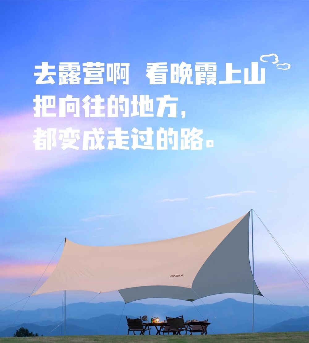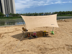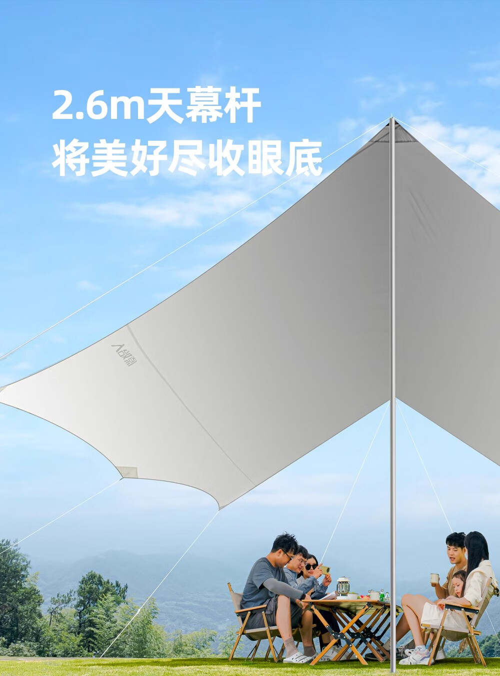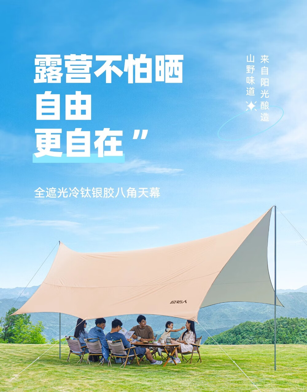 天慕不错,防晒效果很好,头一次买露营装备,在网上对比了好多品牌,最终选着了原始人,没有让我失望,6个小朋友在天慕下面玩,还有几个大人,空间也挺大的。