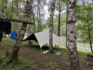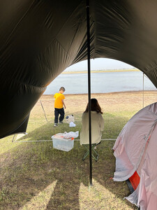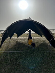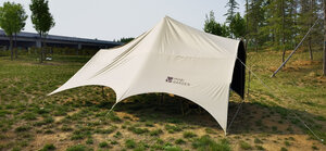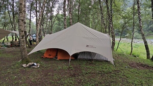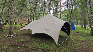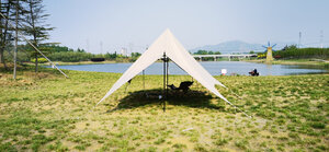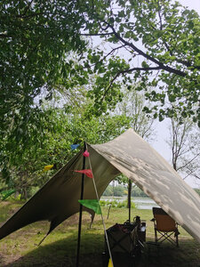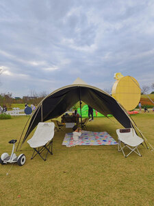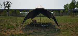 很大很结实的天幕,特别酷,一出场就是最亮的仔。搭起来不难,有人帮着扶住就很好弄,主杆很粗,很牢固,自带防风绳,不累赘。黑胶+牧高笛的牌子+这个做工,很值,露营体验感一下子上升好几个档次。