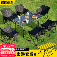 探险者户外折叠椅露营椅子月亮椅沙滩钓鱼椅野餐桌椅家用凳子 软包黑色折叠椅*6+120cm长桌(赠收纳袋)