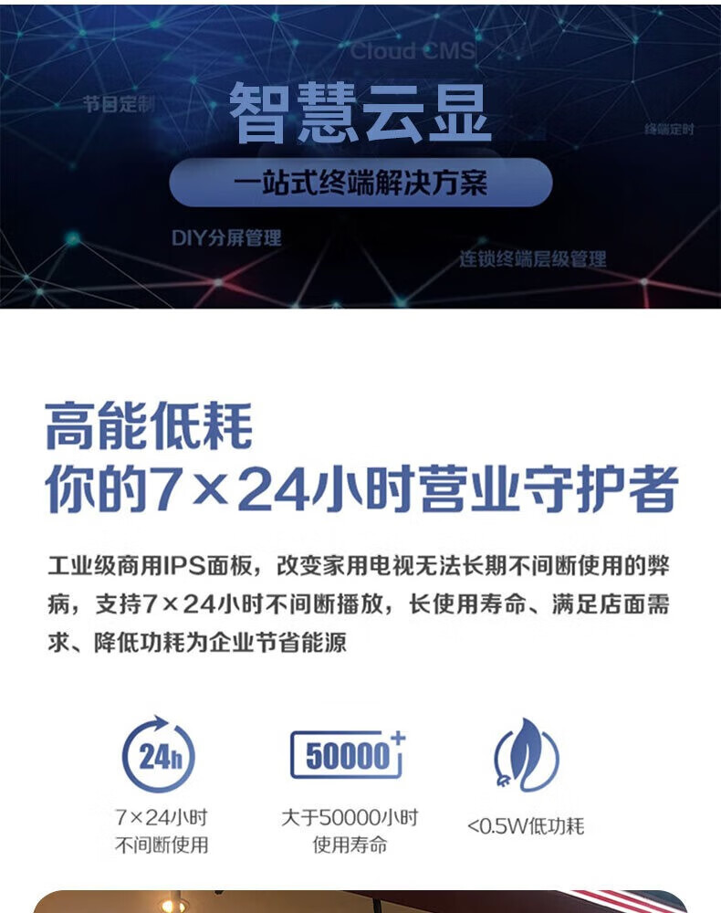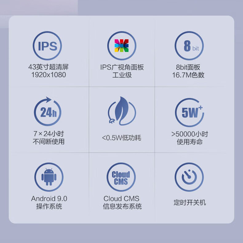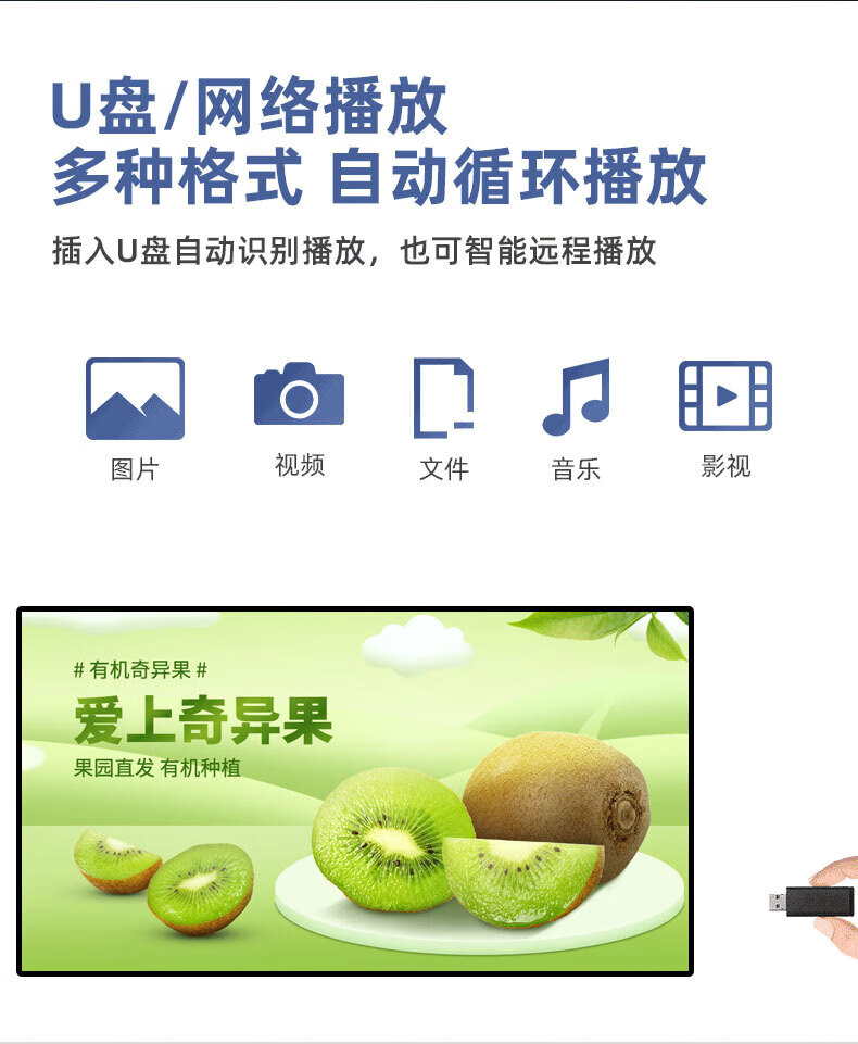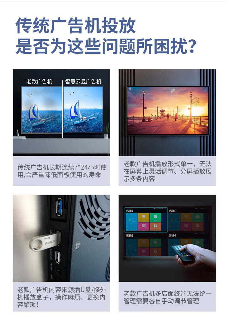 买了3台43寸的,非常好用,这款广告屏效果很好,多张图片会自动轮播,视频也是循环播放的,开机自动播放,可以定时播放,定时开关机,用手机上传操作方便简单,画质非常清晰,很满意,客服服务态度也好👍🏻