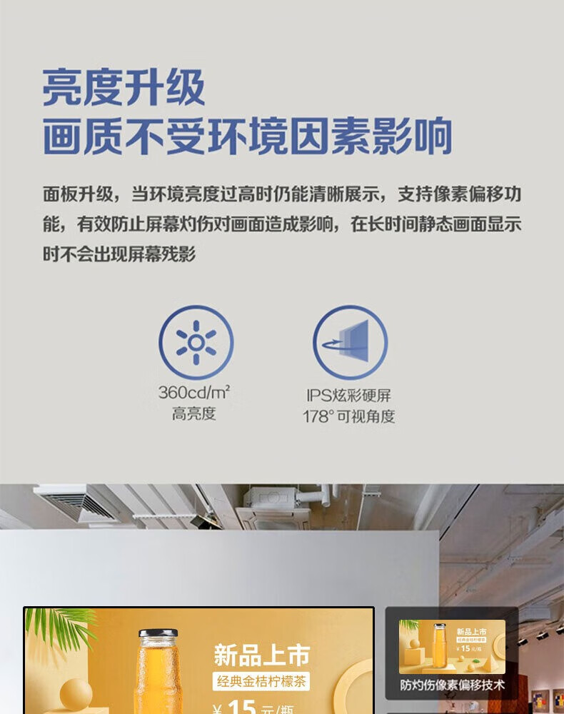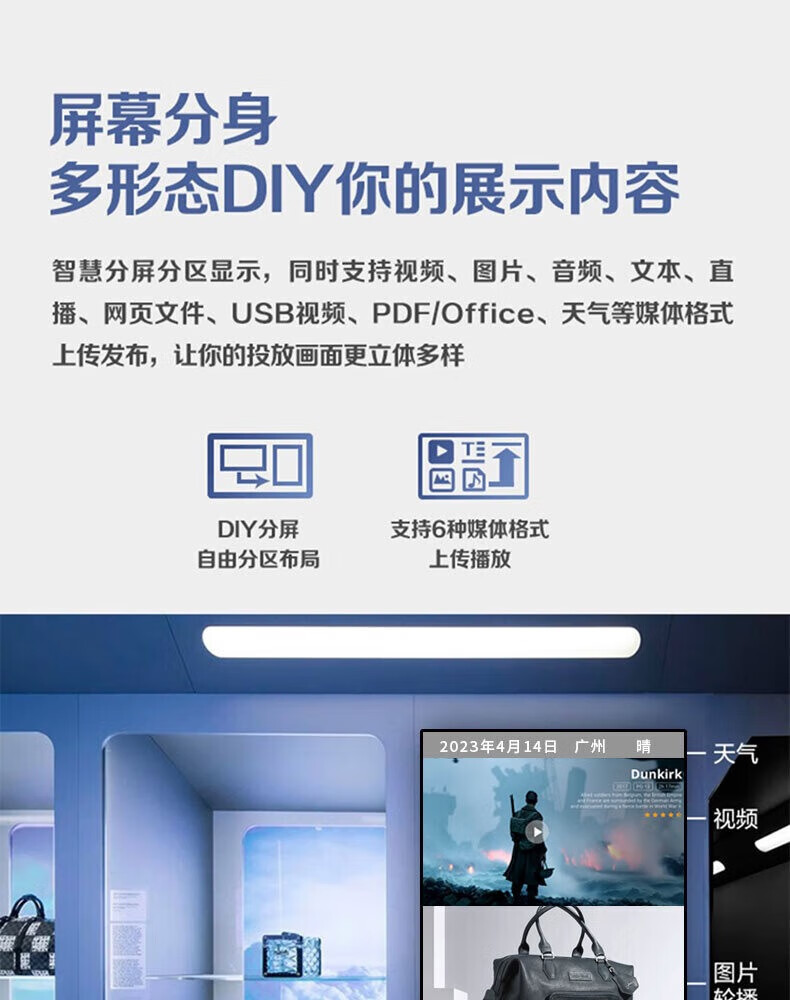 客服是真没的说,直截了当,有耐心,可能其中大家都有没耐心的时候,但是最后成了,好了,系统软件我全会了。功能还挺多,清晰明了,边框窄,设置了自动开关机,设置好每天自动播。屏幕可以自己分格子diy放。