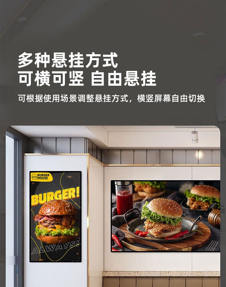 禄雄挂壁广告机显示屏吊挂奶茶店宣传屏展厅竖屏超窄边4K高清餐饮写字楼商用显示器 吊挂单机版-赠送16G U盘【横屏】 65英寸【高清高亮+内置音响+壁挂/吊挂】