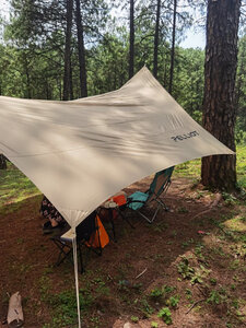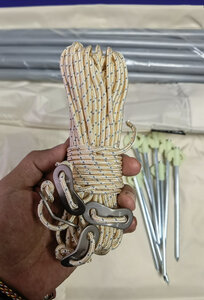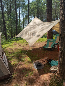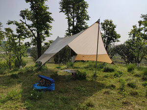 天幕颜值不错,拼色很显档次。支撑杆和拉绳安装设计比较合理,能快速安装,地钉稍微软了一点,脚一踩就弯了,用锤子掰直后不影响使用。天幕的防晒效果一般,但是当初买的时候做了功课,专门考虑了采光和防晒的取舍,但是还是建议直接黑胶天幕走起。伯希和这个牌子是几年前偶然看见的,买过东西不少,基本没有失望的,伯希和靠谱。