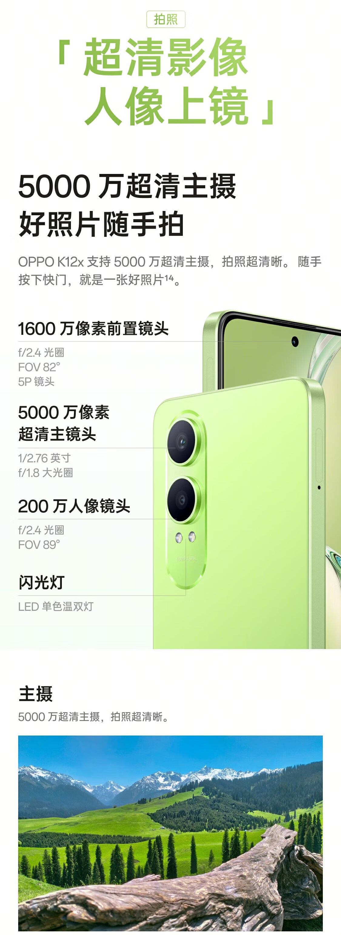 OPPOK12x5G智能手机。 外形外观:背面绿色很漂亮,清新又美观,男女都适合。屏幕很大,手机尺寸也比较大。 屏幕音效:显示清晰,分辨率高。音响音质好,色彩绚丽,手机上看电影也不错。 拍照效果:拍照效果还可以。 其他特色:配套的有充电器和电线,充电速度快。
