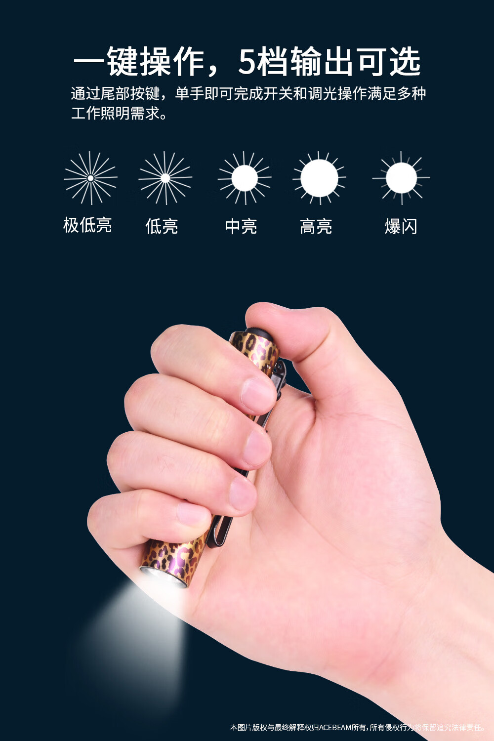 在关闭状态下,半按尾部或1秒内快速完全按下尾部按键即可在“极低亮→低亮→中亮→高亮”循环切换。