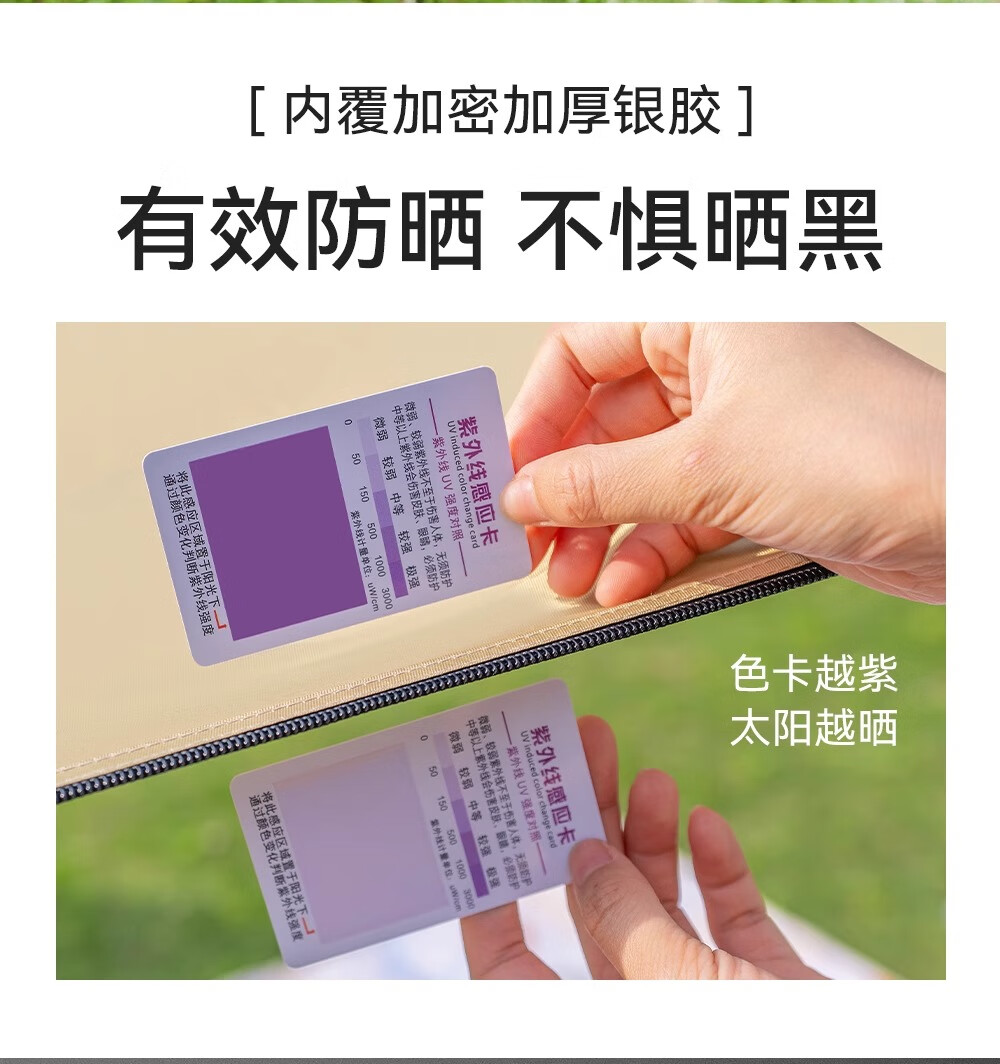 刚收到就迫不及待的露营去了,特别喜欢,遮阳效果很好。对比了好几个品牌,这个性价比最高。重点要夸夸它的免搭建设计,就跟开雨伞似的,一键开合。而且,客服的服务很赞。闭眼入不亏,已经~给身边的朋友啦!