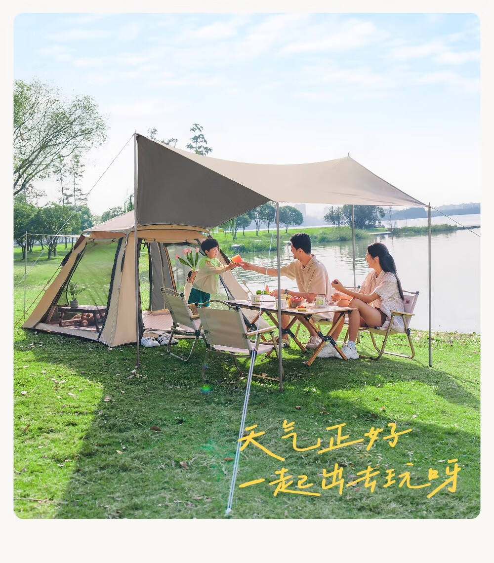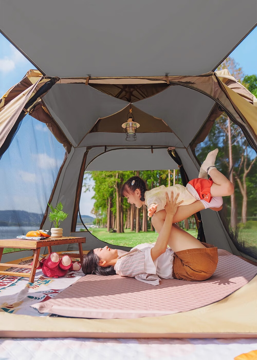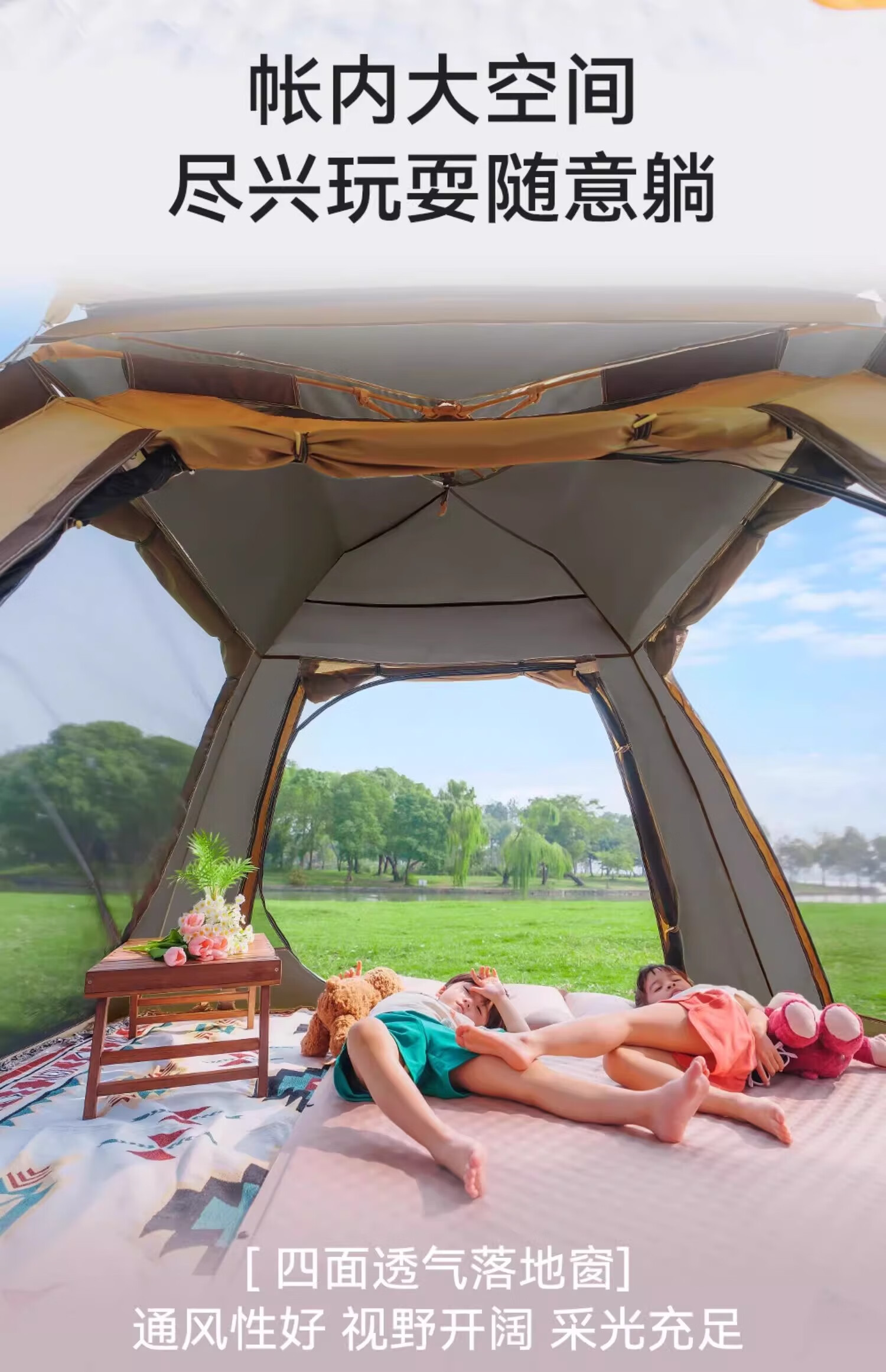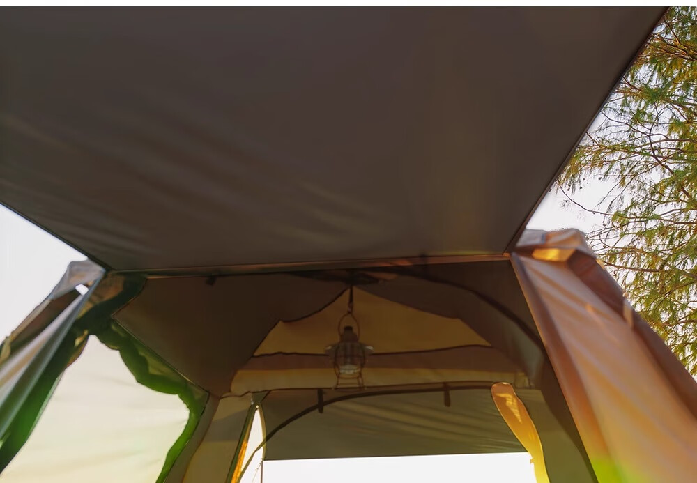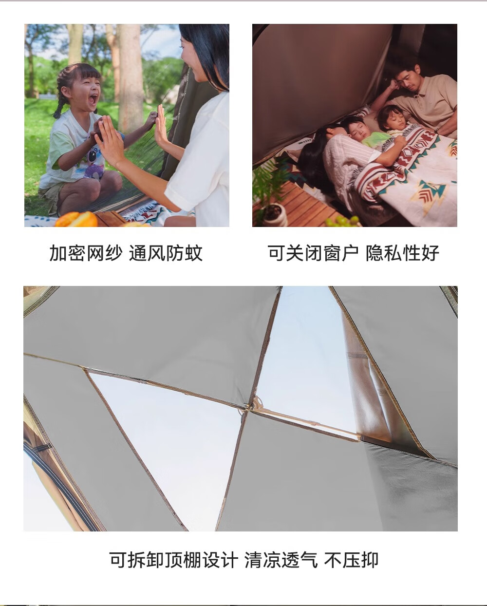 全家露营的刚需装备!2.8*2.4m的空间超宽敞,4-6人在里面活动完全不挤,自带的小天幕区能喝茶打牌,实现"一室一厅"自由[__LINK_ICON]。黑胶涂层防晒力拉满,UPF50+实测正午温度比外面低5℃,雨天防水也靠谱,底部PE地垫还能隔绝潮气。门窗都是双层设计,防蚊又通风,带娃过夜既安心又舒适。
