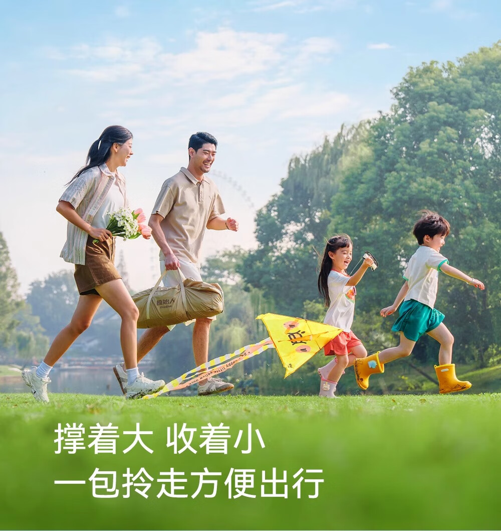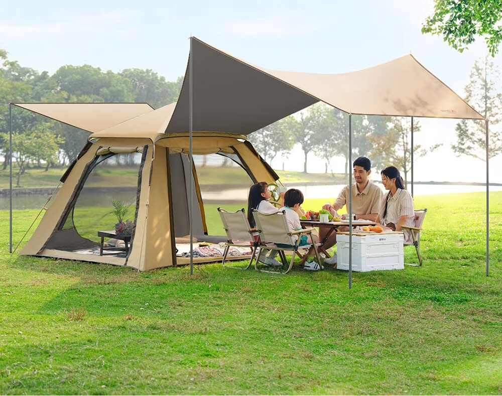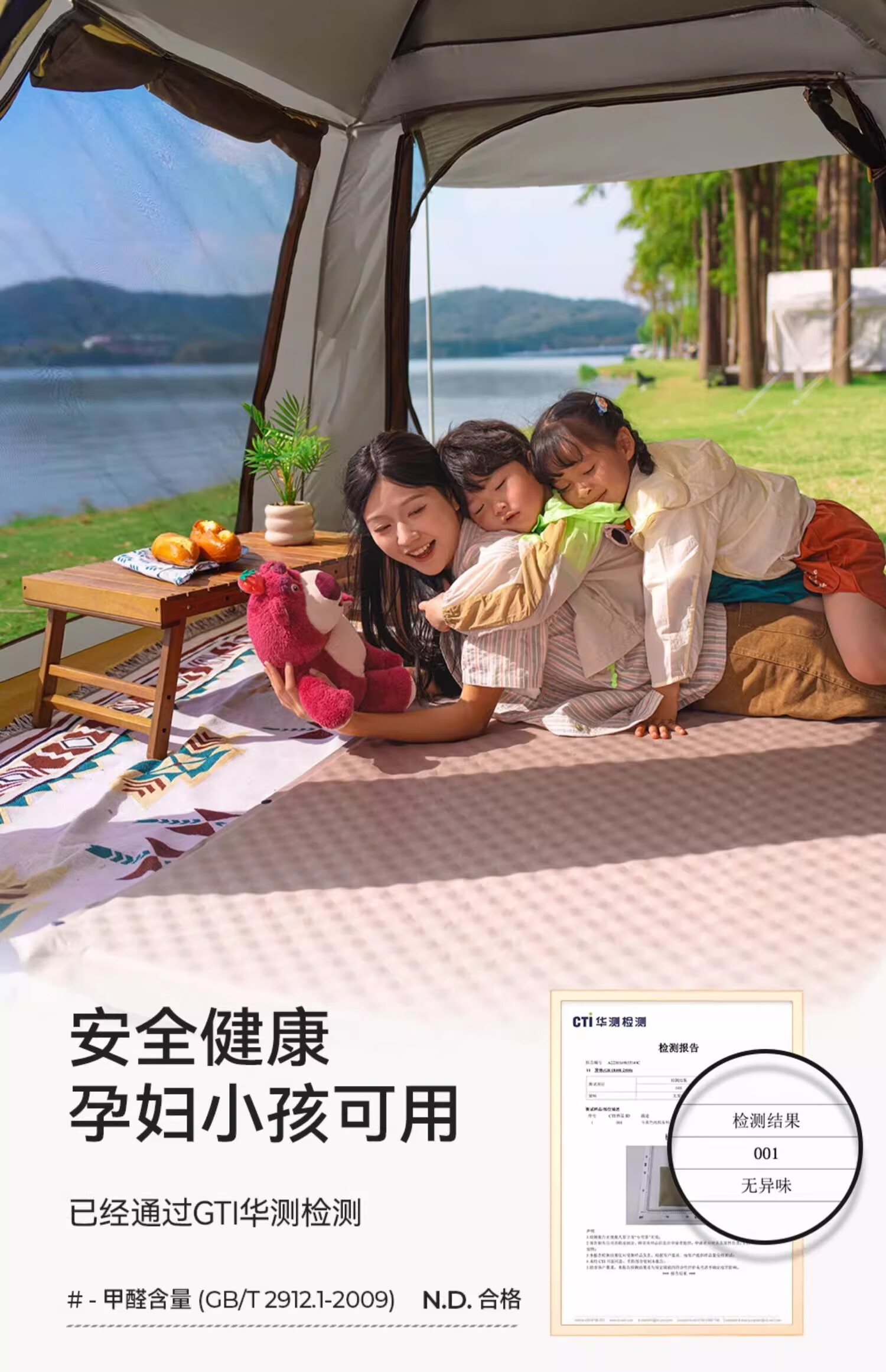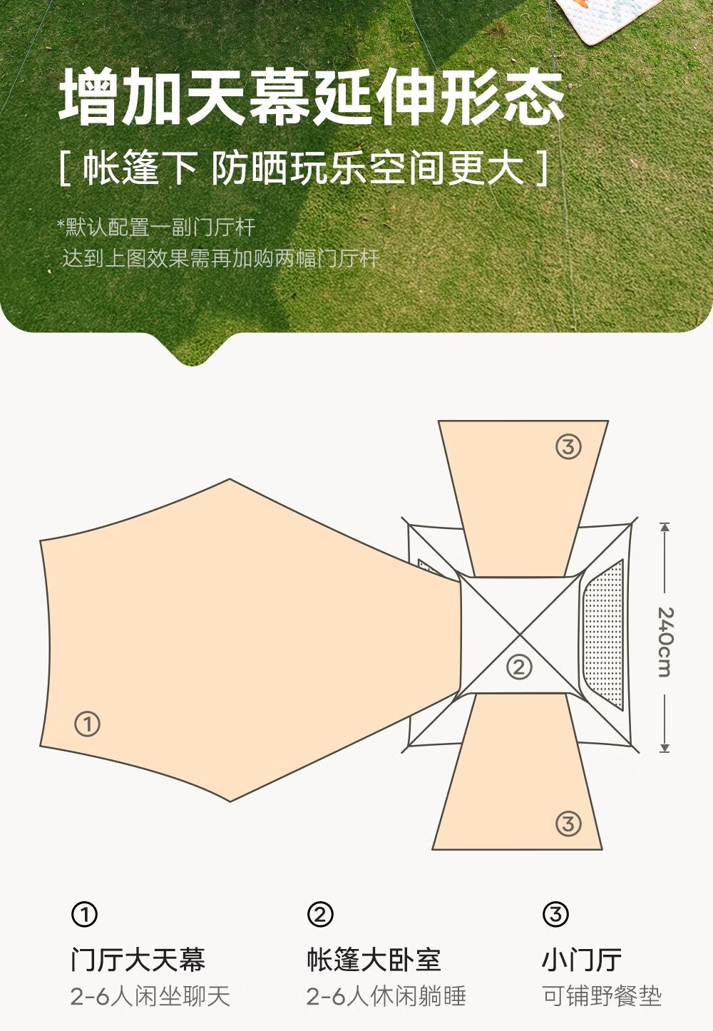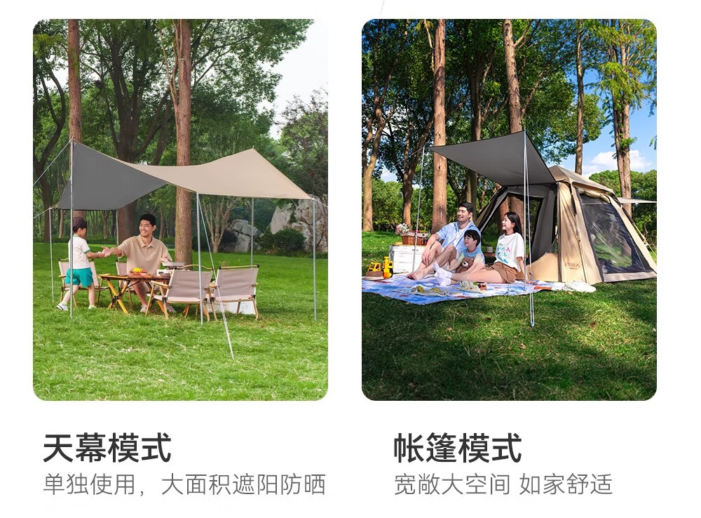 全家露营的刚需装备!2.8*2.4m的空间超宽敞,4-6人在里面活动完全不挤,自带的小天幕区能喝茶打牌,实现"一室一厅"自由[__LINK_ICON]。黑胶涂层防晒力拉满,UPF50+实测正午温度比外面低5℃,雨天防水也靠谱,底部PE地垫还能隔绝潮气。门窗都是双层设计,防蚊又通风,带娃过夜既安心又舒适。