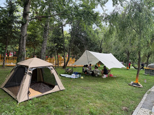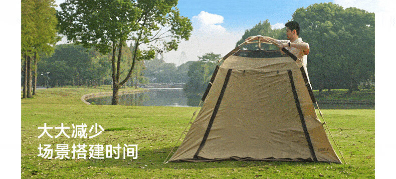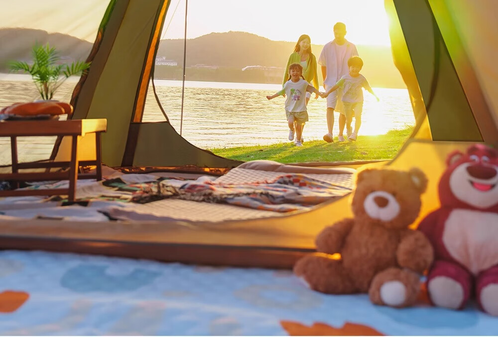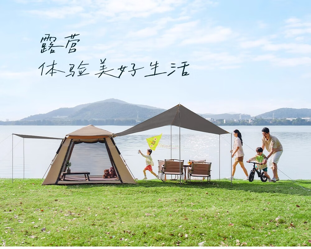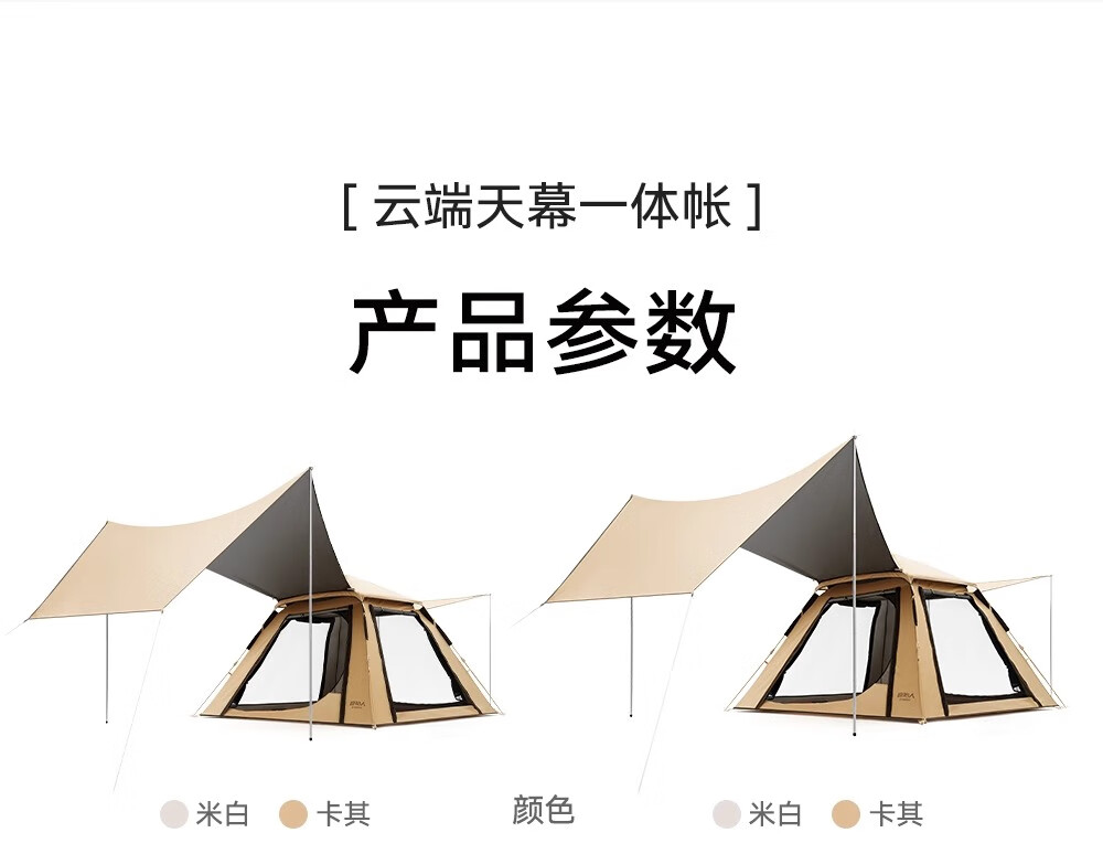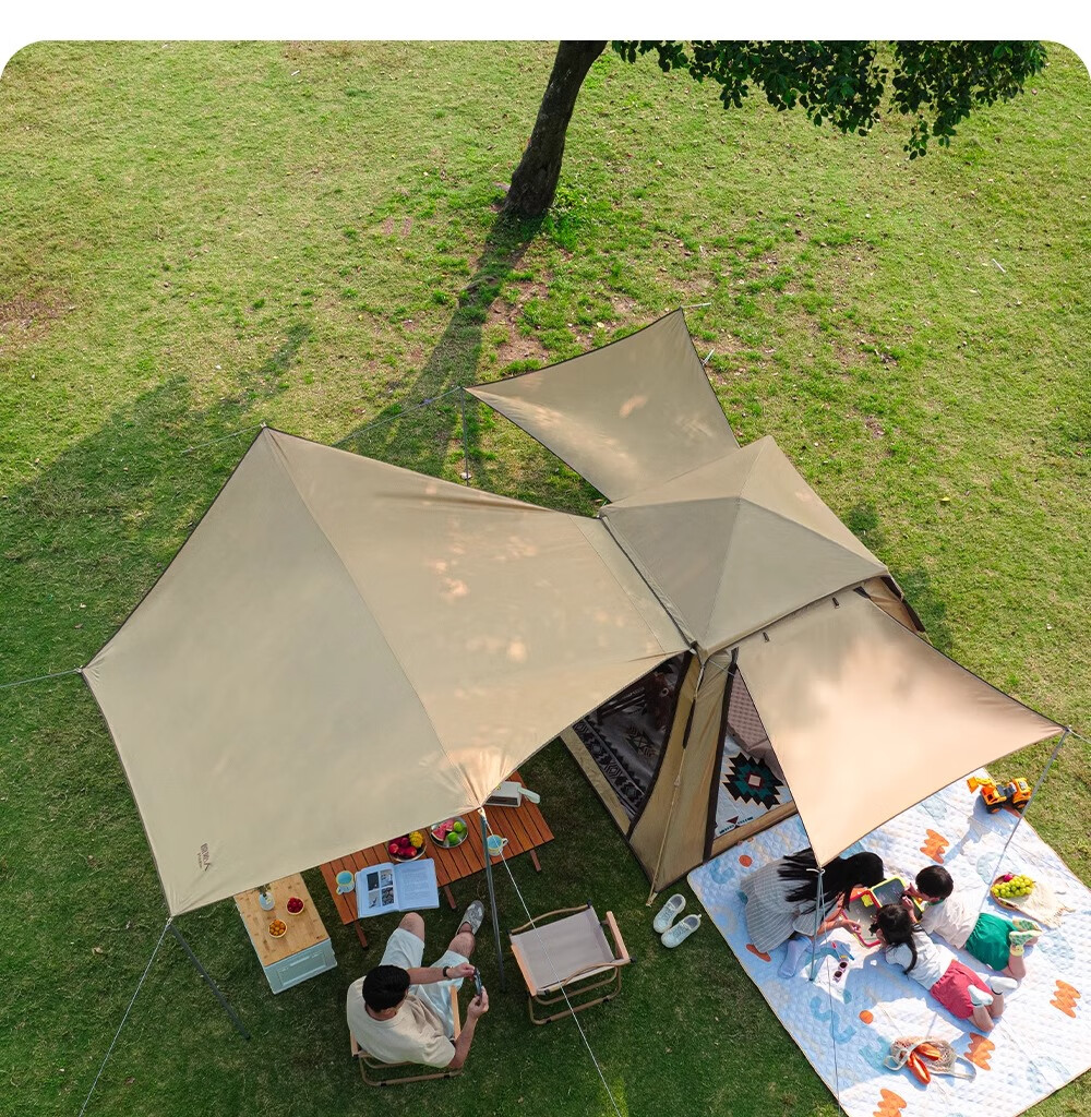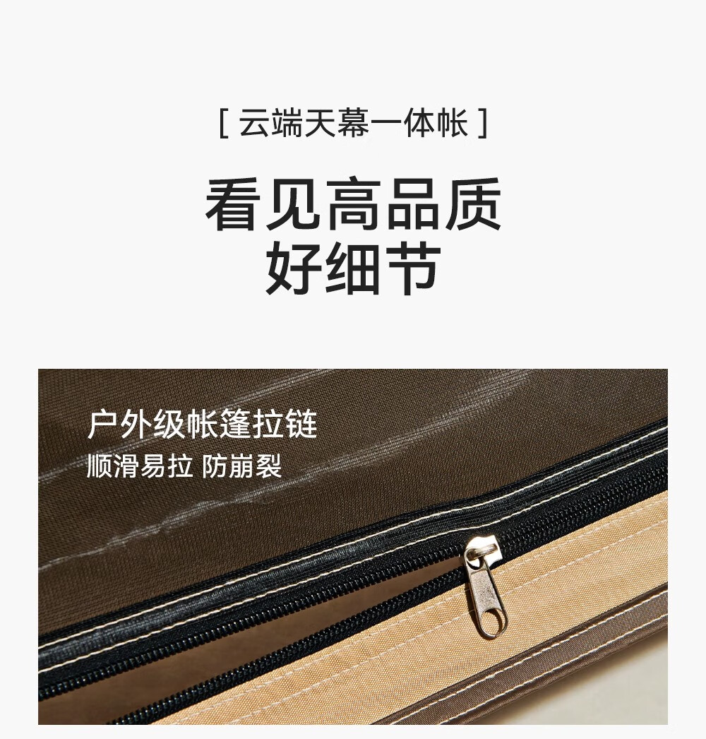 全家露营的刚需装备!2.8*2.4m的空间超宽敞,4-6人在里面活动完全不挤,自带的小天幕区能喝茶打牌,实现"一室一厅"自由[__LINK_ICON]。黑胶涂层防晒力拉满,UPF50+实测正午温度比外面低5℃,雨天防水也靠谱,底部PE地垫还能隔绝潮气。门窗都是双层设计,防蚊又通风,带娃过夜既安心又舒适。