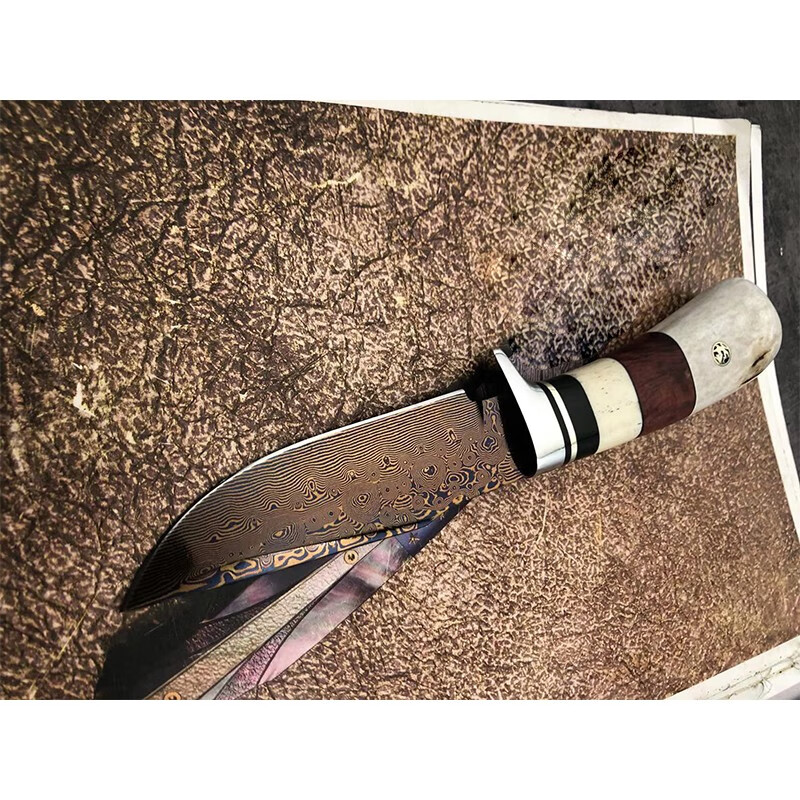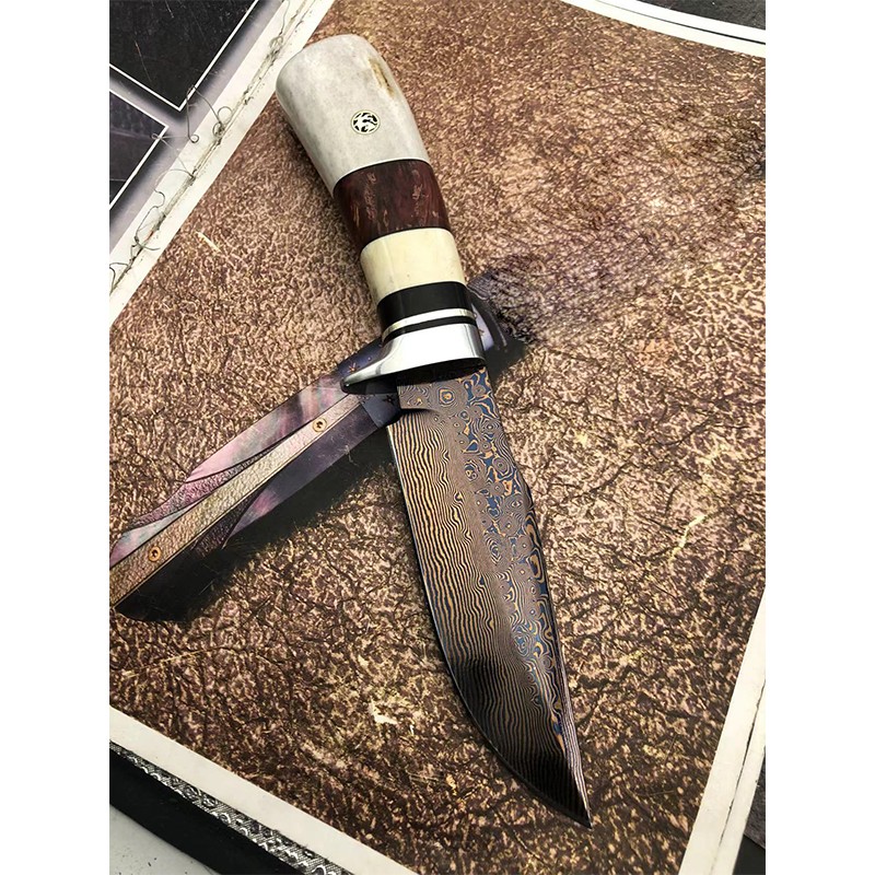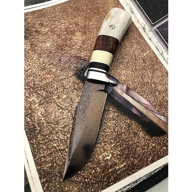 雨轩户外锻打大马士革小刀刀身炭烤蓝北欧猎小刀户外直刀收藏送礼刀具