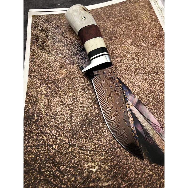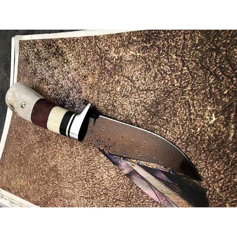 雨轩户外 羽毛纹大马士革钢直刀猛犸臼齿 矿化石琥珀鹿角手柄收藏送礼刀具