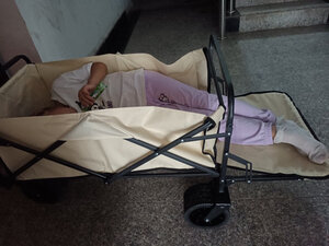 收到货,第一时间拆包装,感觉质量还是比较好的,后门可以打开,孩子可以躺在里面。前面有储物袋,轮子也很宽,拉起来很稳,前面两个轮子是万向轮,都有刹车,以后去户外露营,带帐篷什么的都很方便。
