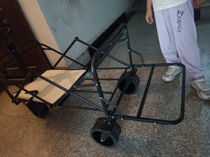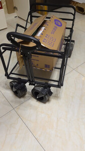 这是我买的第四个营地车,首先声明,我只是周末公园晒太阳,并不是重度露营者,但是还是本着精打细算,考虑再三,买了这款。之前三款都退货了,有个支架太细,有个没有品牌合格证,有个虚标车架长宽高。最终选了这个品牌合格证,尺寸都标注清楚,车架也厚实。 车子容量挺大,后面还能放开,能到一些超长货物,轮子也够宽,轮子要是充气胎就更好了