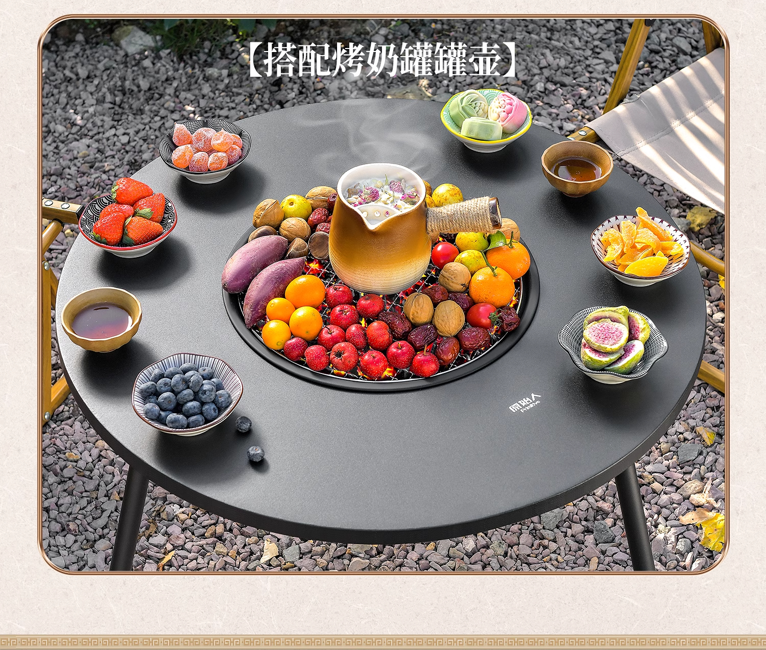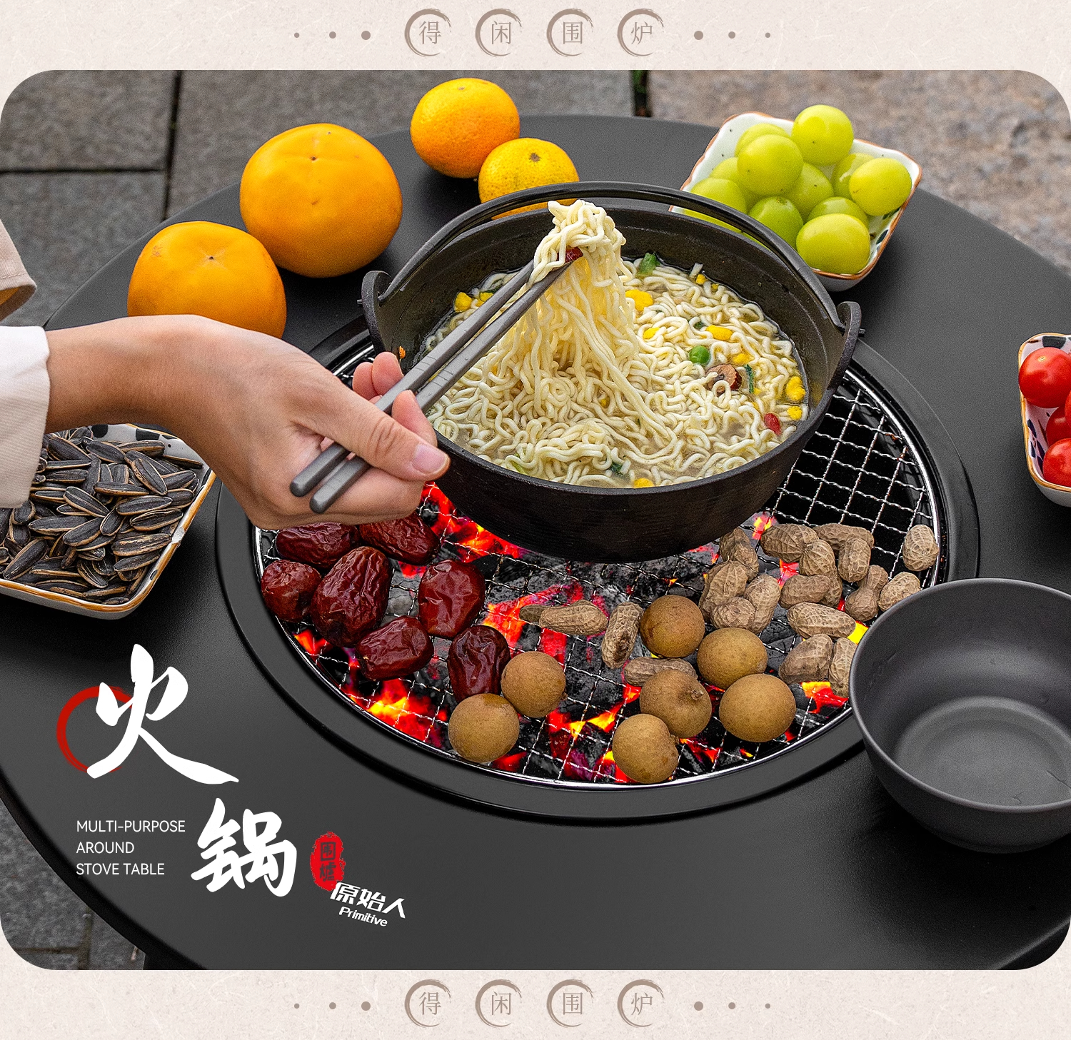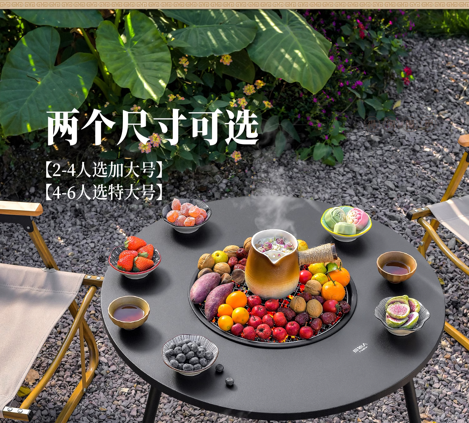 原始人围炉煮茶烧烤炉家用室内烤火炉套装户外烧烤桌取暖盆木炭烧烤架 80cm大桌围炉+煎盘+收纳包+盖板